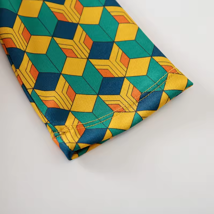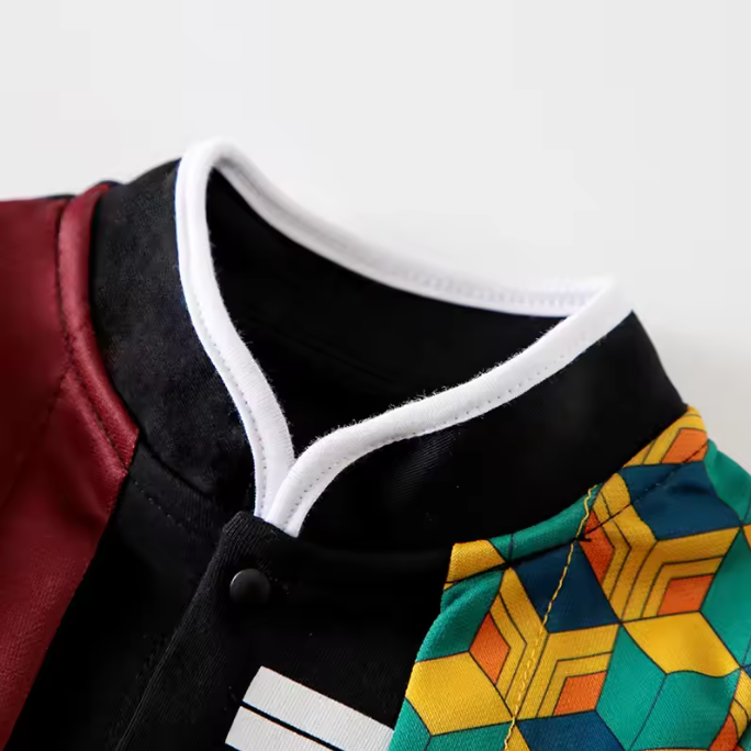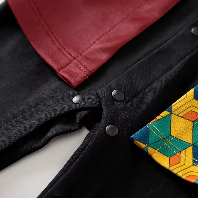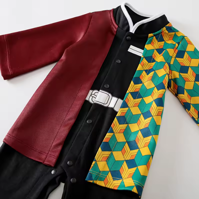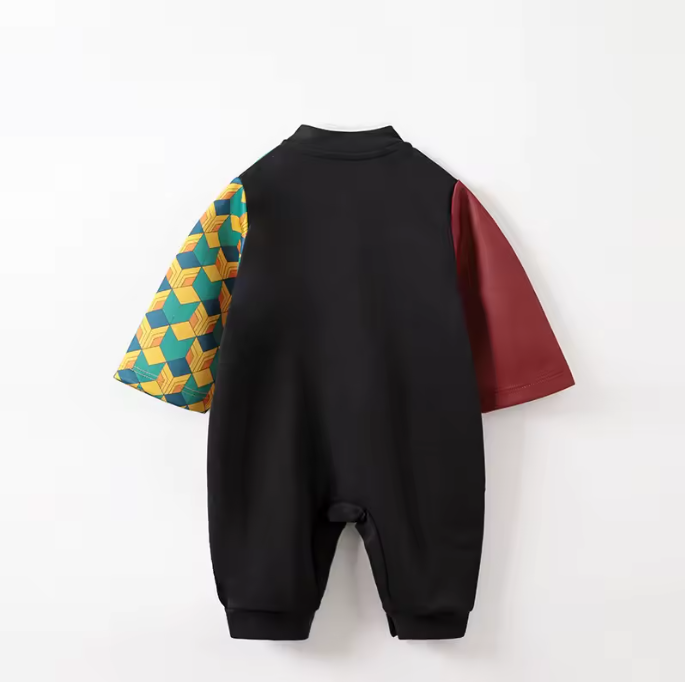 This romper features a striking half-and-half design inspired by Giyu Tomioka, blending elegance and boldness. Rich maroon meets a geometric green-and-orange pattern for a truly unique look. Soft, breathable fabric keeps your baby comfy from playtime to photoshoots.