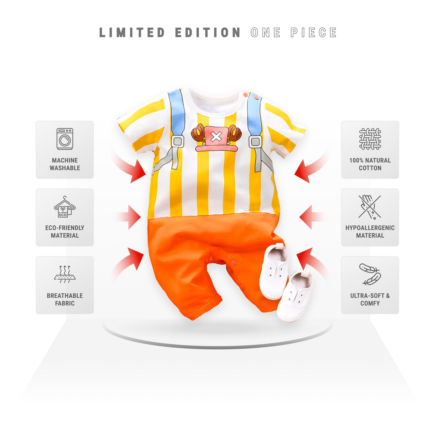 Let your baby sail into cuteness with this romper inspired by Tony Tony Chopper — the lovable reindeer doctor from One Piece. With cheerful stripes, bright colors, and a whimsical design, it’s perfect for photoshoots, playdates, or everyday fun. One look, and you’ll be hooked!