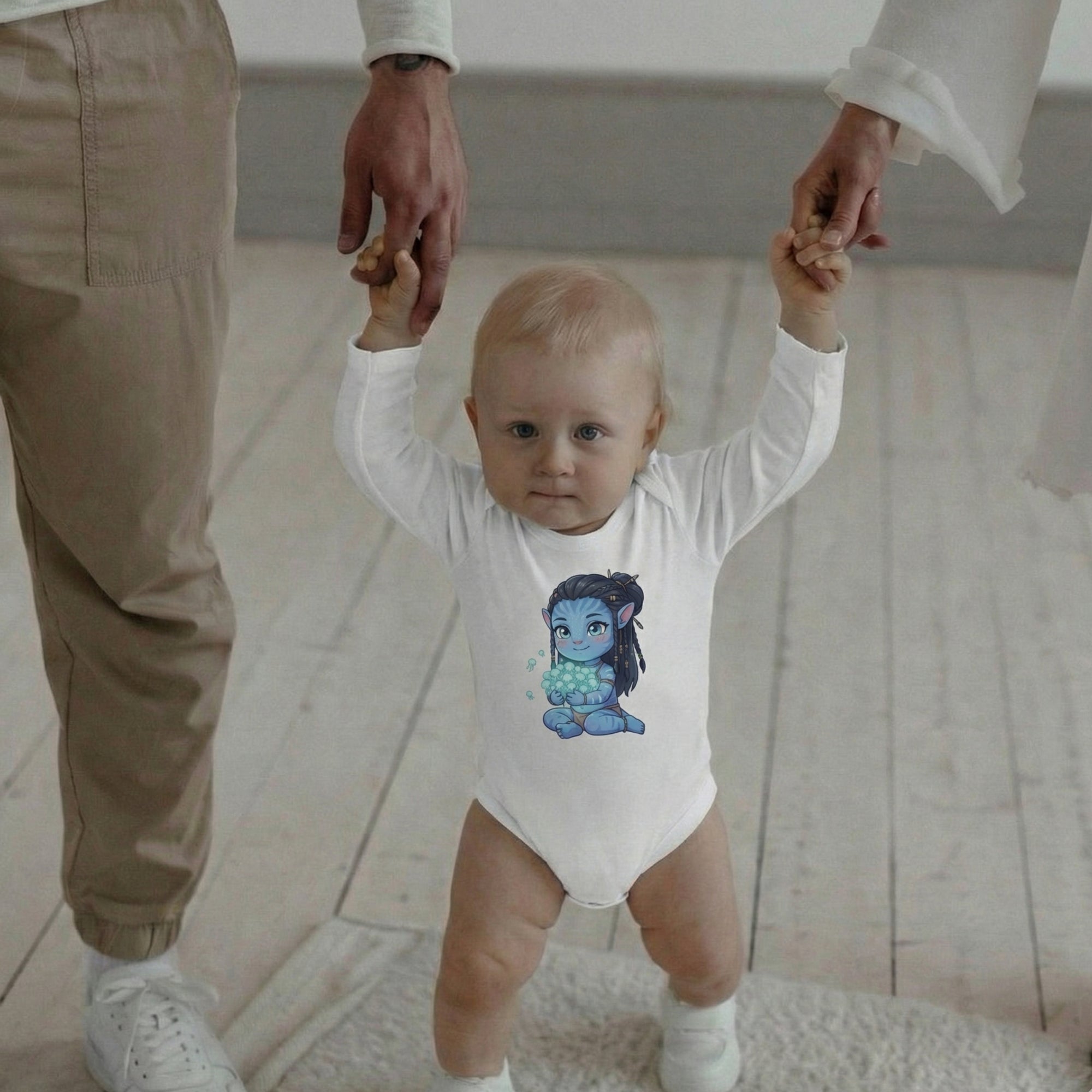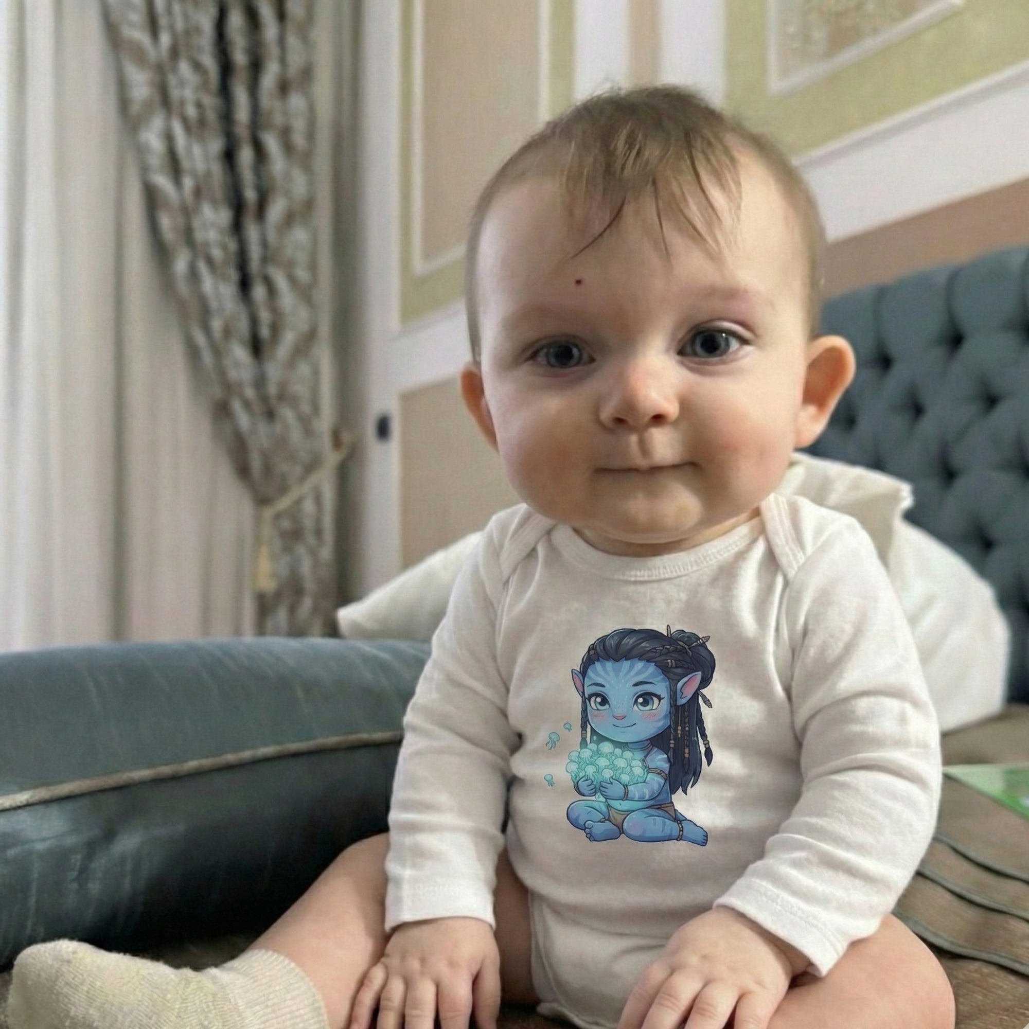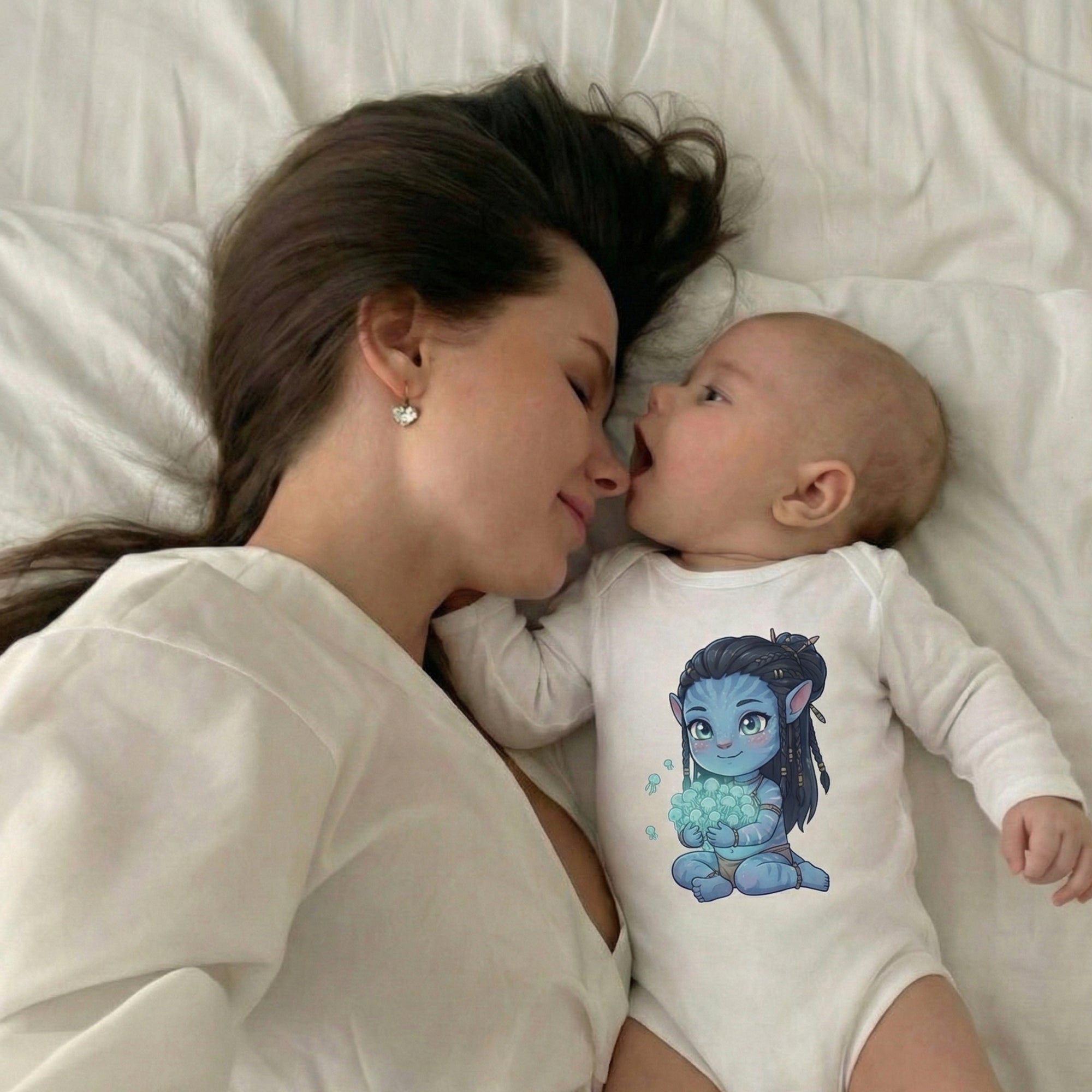 Suit up your little explorer in this playful white romper inspired by the brave heart of Jake Sully and the wild beauty of Pandora. Made from ultra-soft, skin-friendly cotton with breathable stretch, it keeps your baby comfy through crawling, cuddles, and nap-time resets. The vibrant, fade-resistant print features a chibi Na’vi-style adventurer with iconic Pandora vibes and a glowing spirit-energy touch, while durable stitching and tag-free seams ensure cozy comfort wash after wash.