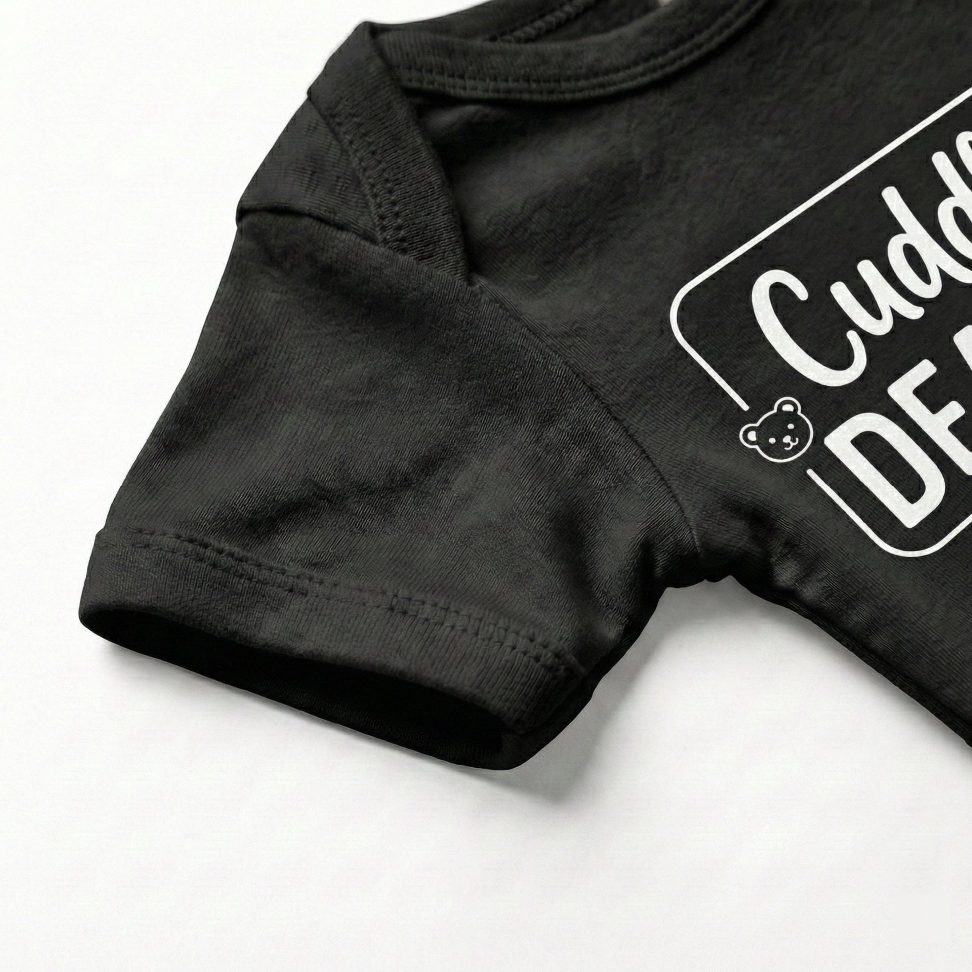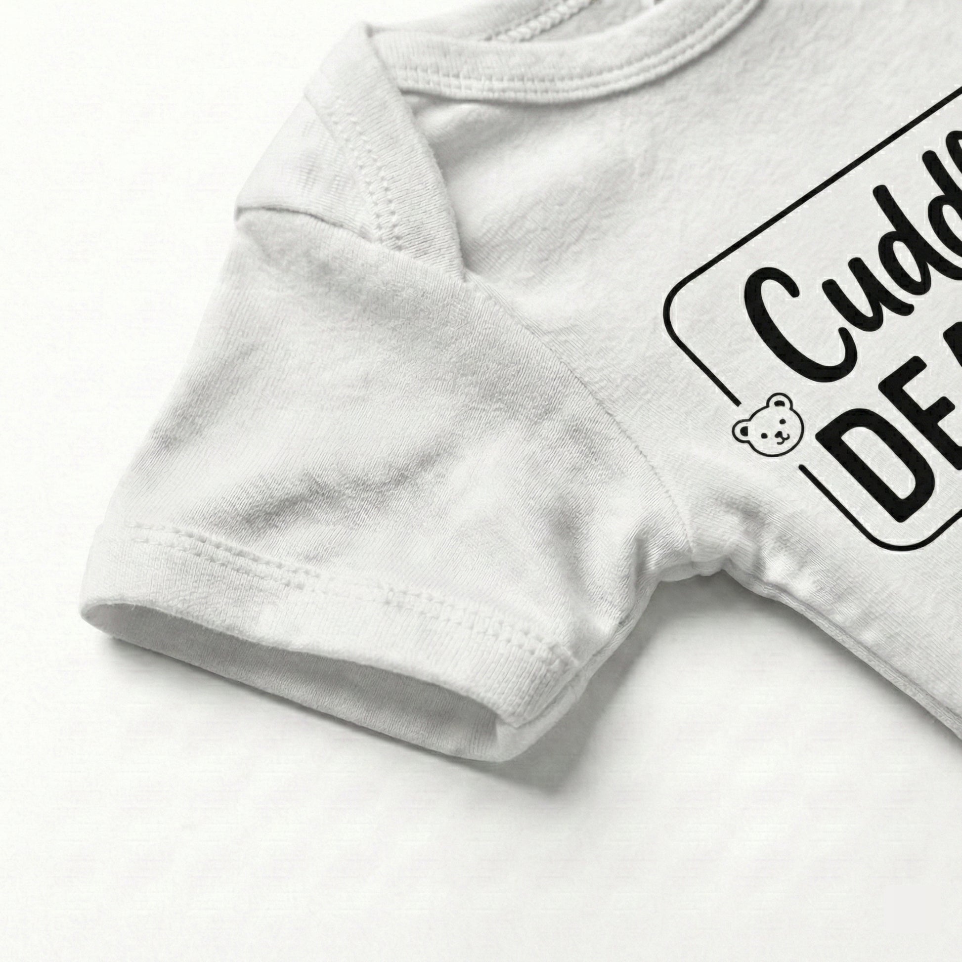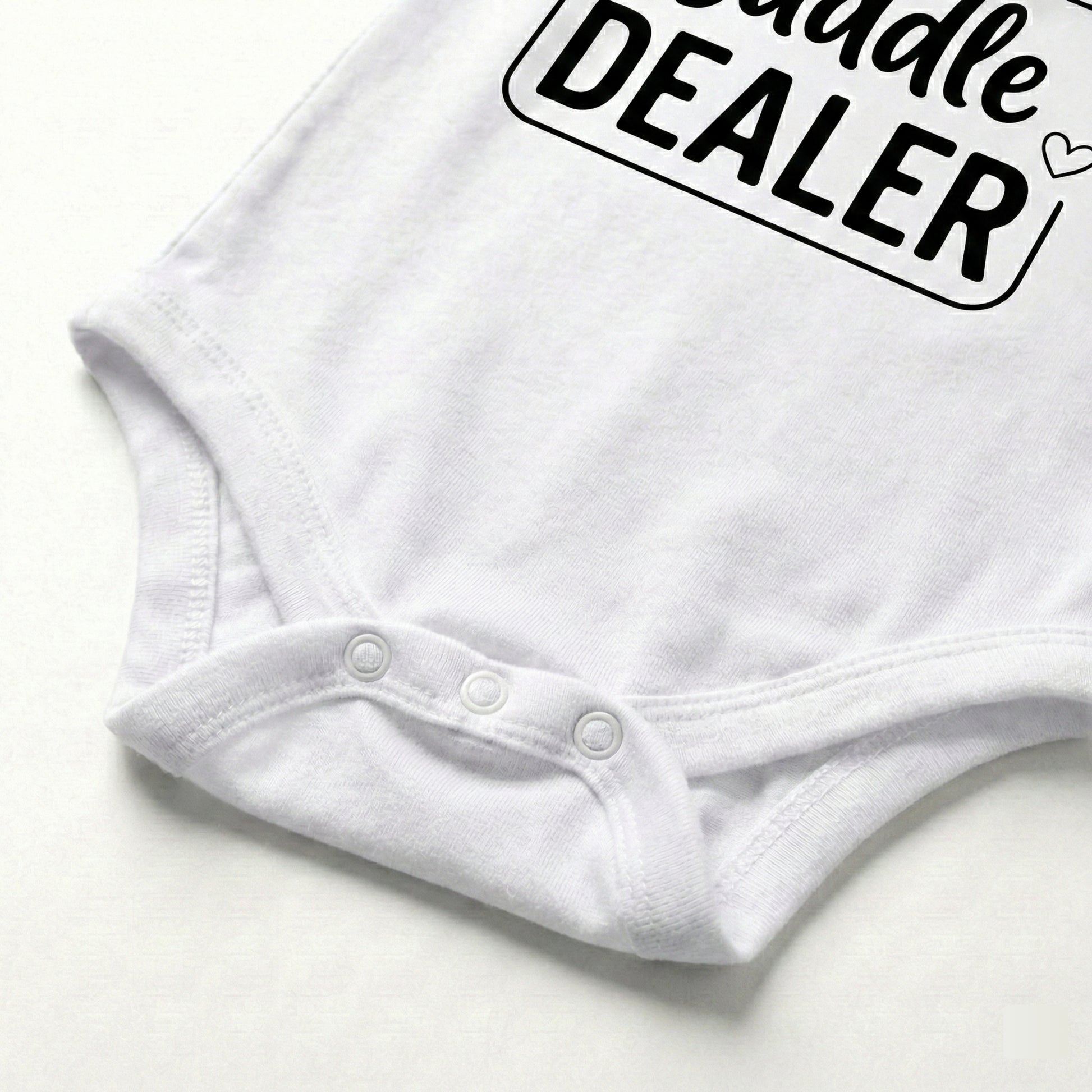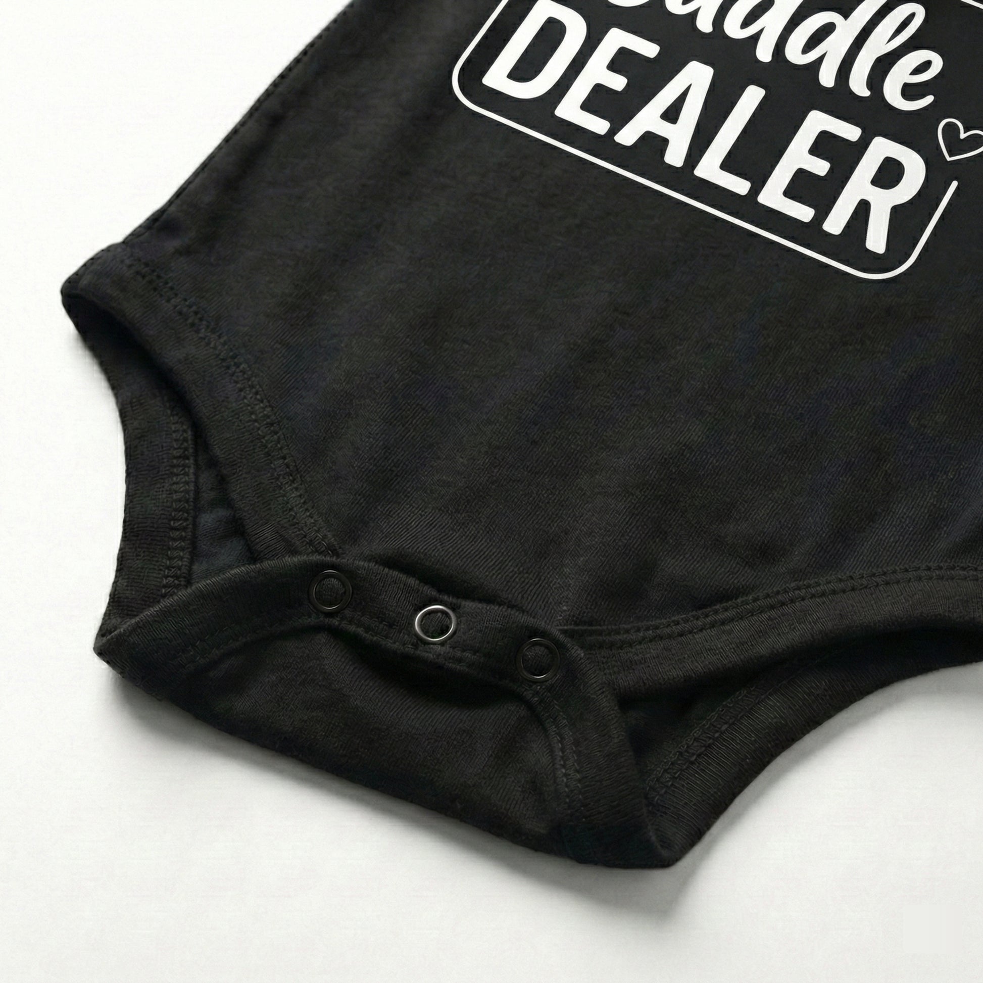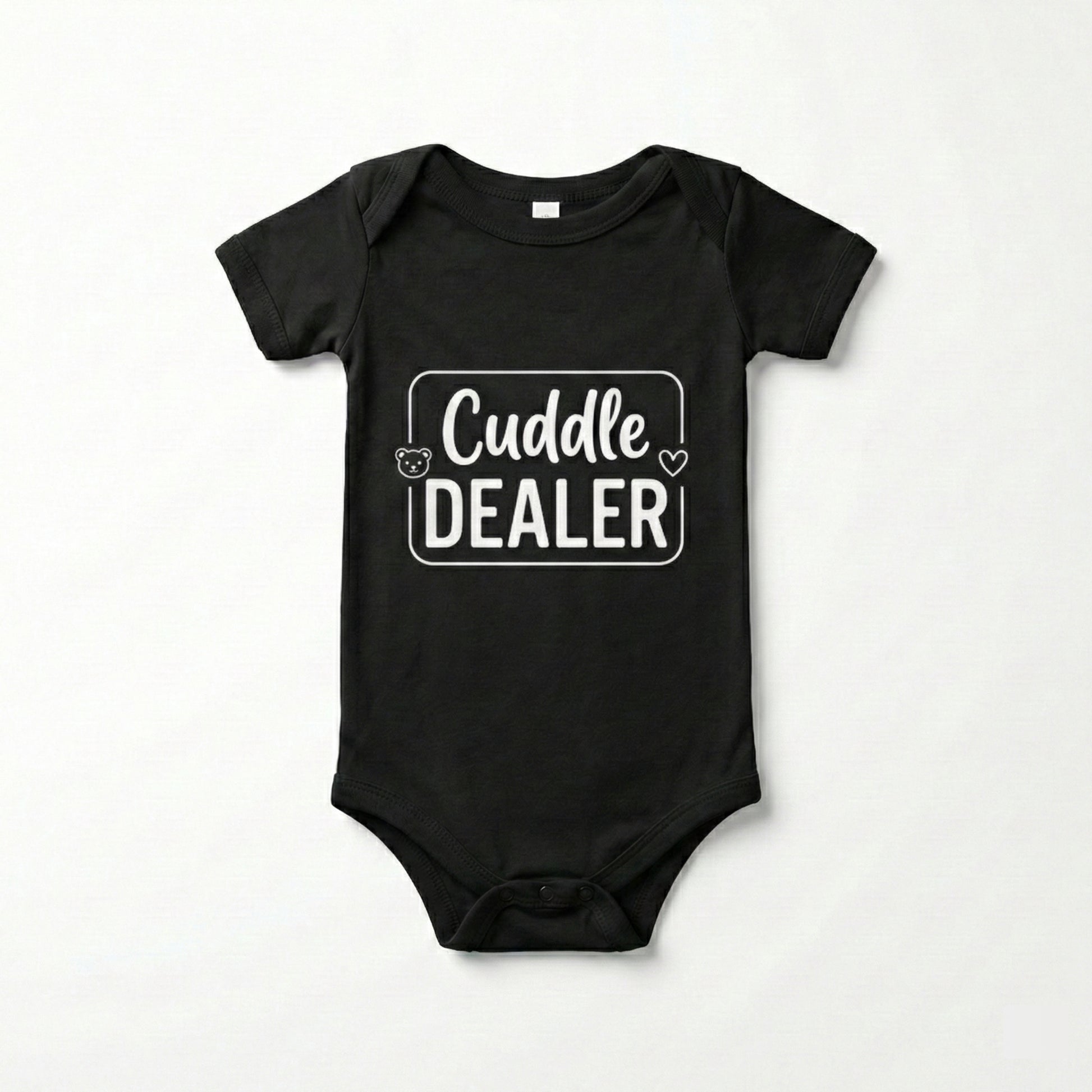 Warning: this little one is handing out hugs on demand! This adorable “Cuddle Dealer” bodysuit is perfect for your tiny snuggle expert who knows exactly how to melt hearts with one look. Made from ultra-soft, breathable cotton with a comfy stretch, it keeps your baby cozy through nap-time cuddles, stroller snugs, and all the “pick me up!” moments. The clean black print pops beautifully on bright white fabric, and the easy snap closures make diaper changes quick and stress-free.