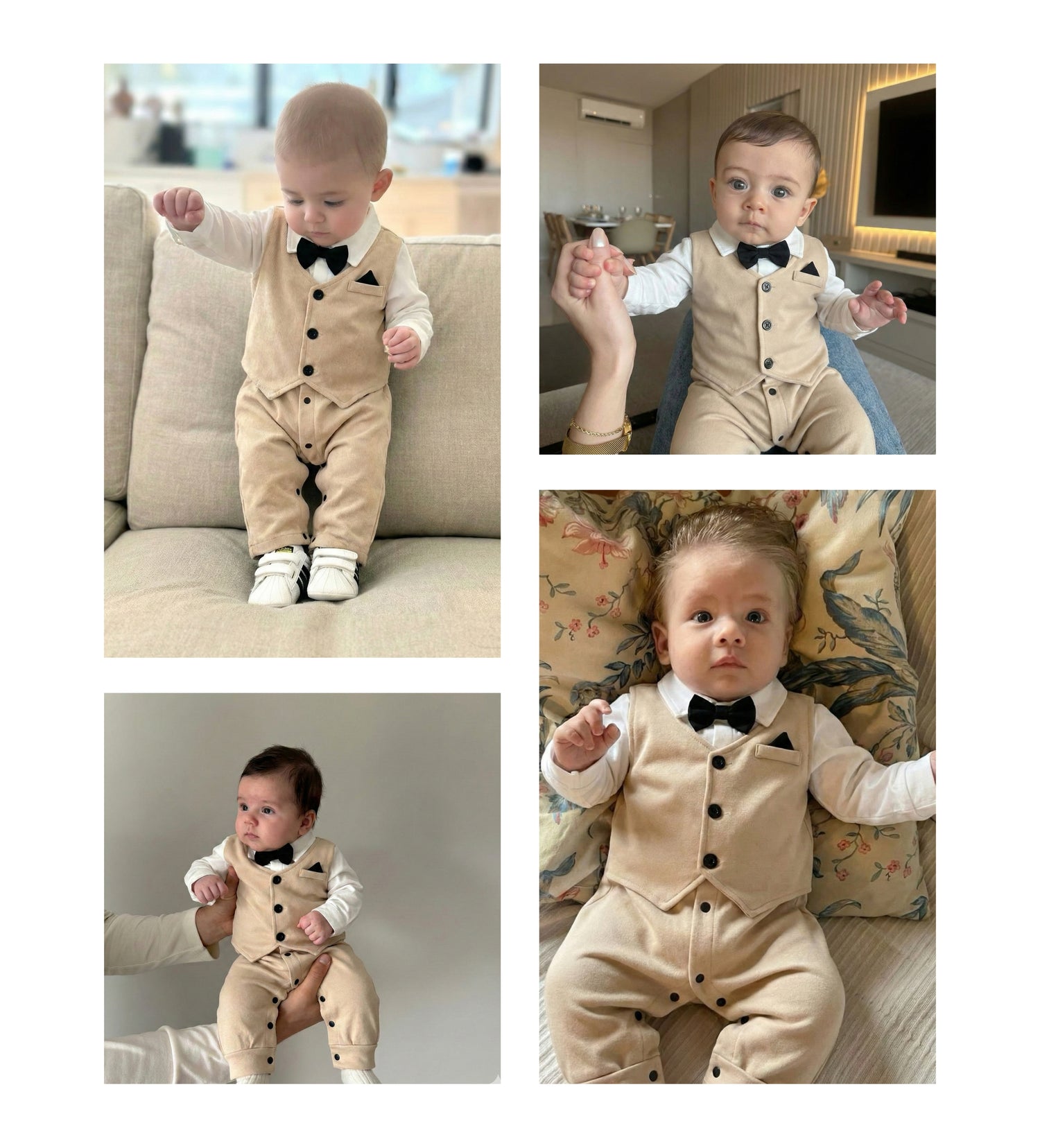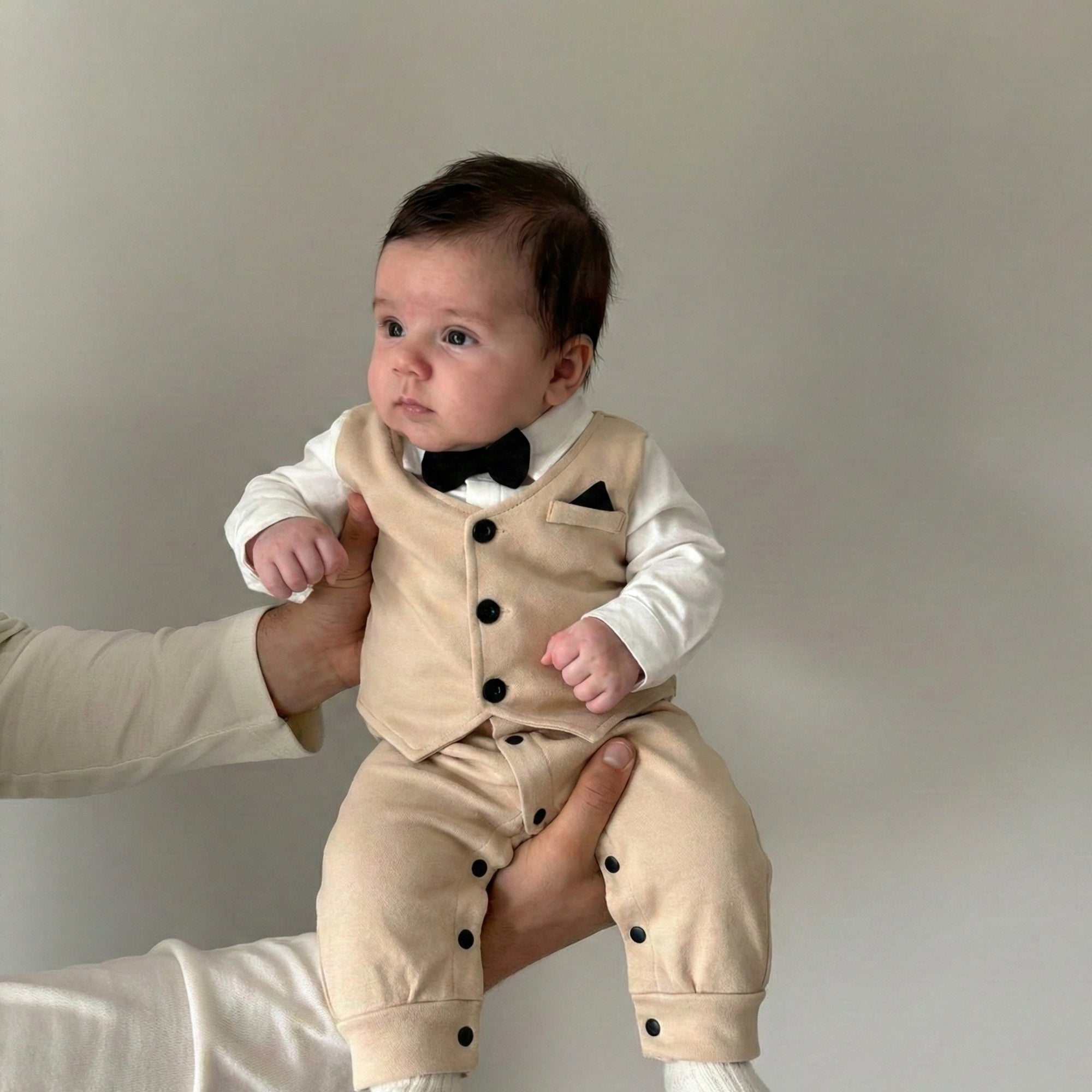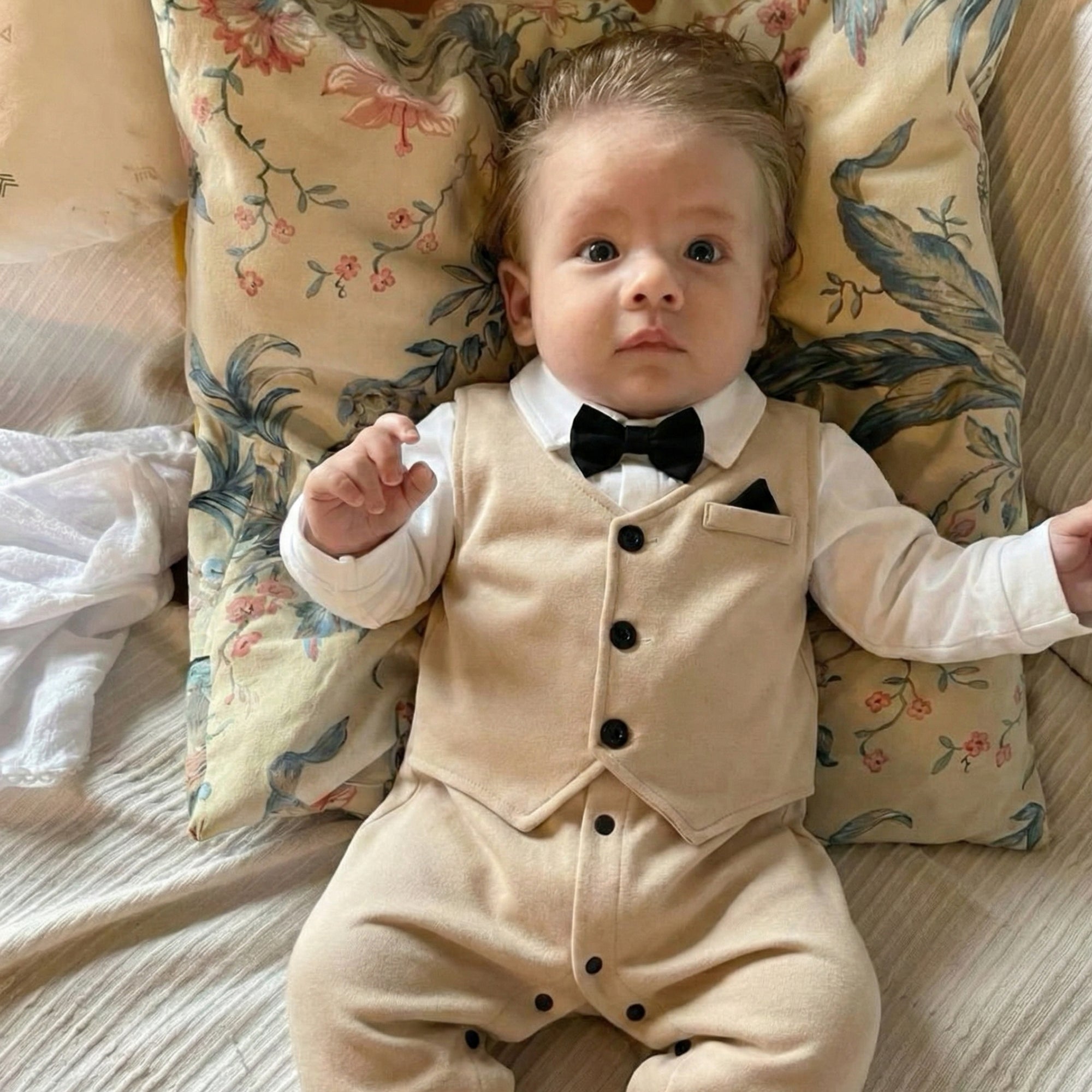 Make every day feel like a special occasion with this elegant suit-style romper — soft, comfy, and full of classy charm. The crisp white “shirt” look, warm champagne-beige vest design, and adorable black bowtie + pocket square detail create an instant dressed-up look, while the baby-friendly fit keeps your little gentleman cozy from cuddles to nap time.