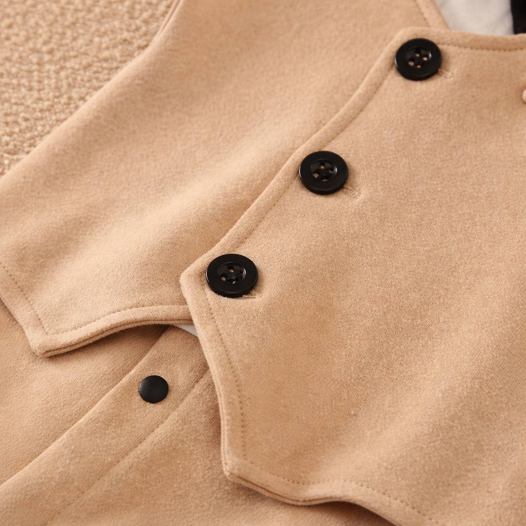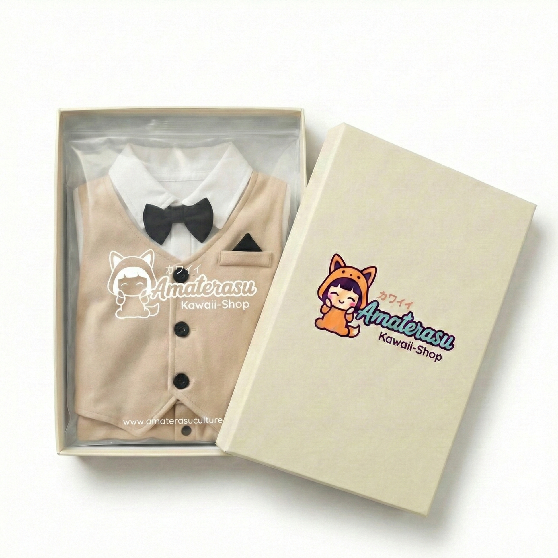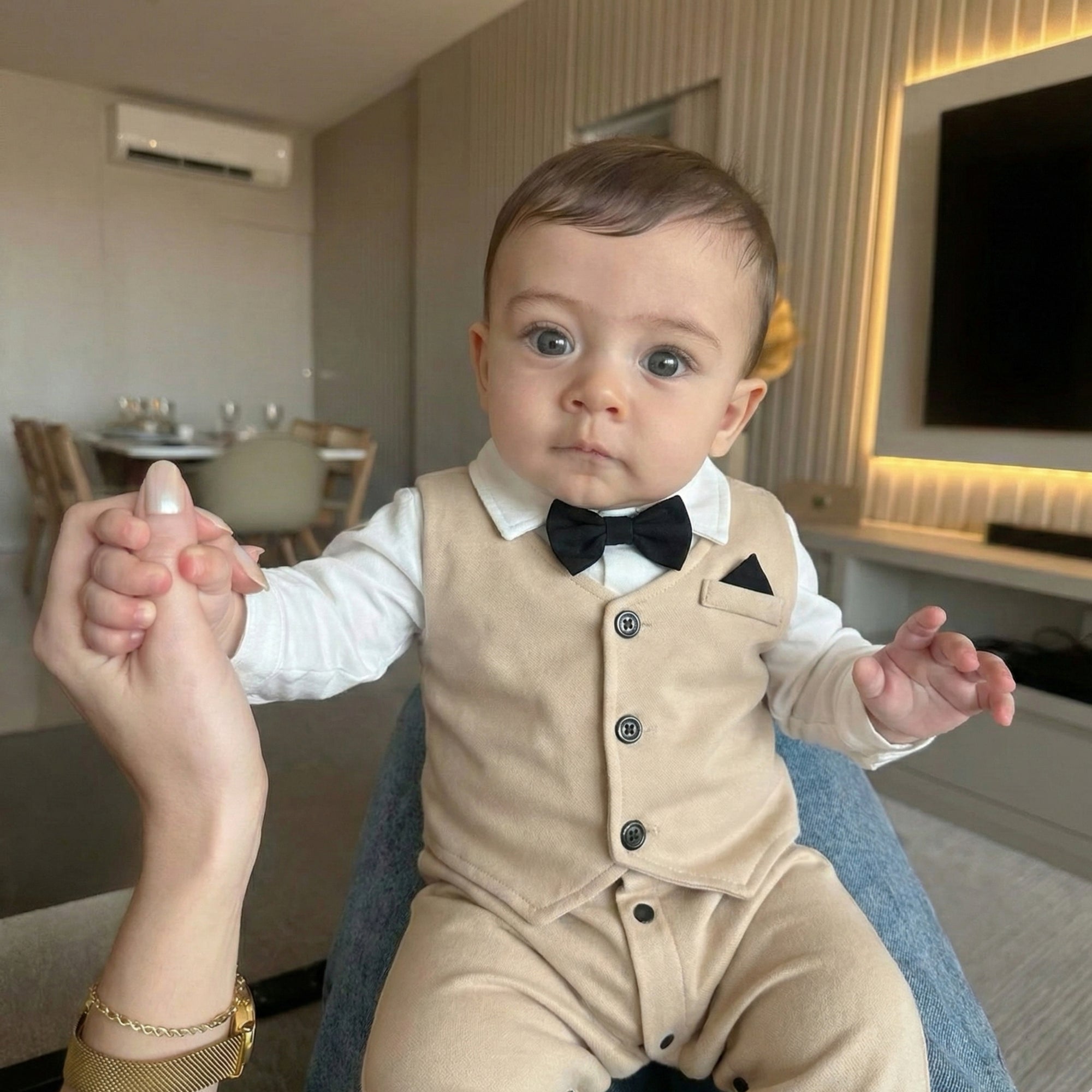 Make every day feel like a special occasion with this elegant suit-style romper — soft, comfy, and full of classy charm. The crisp white “shirt” look, warm champagne-beige vest design, and adorable black bowtie + pocket square detail create an instant dressed-up look, while the baby-friendly fit keeps your little gentleman cozy from cuddles to nap time.