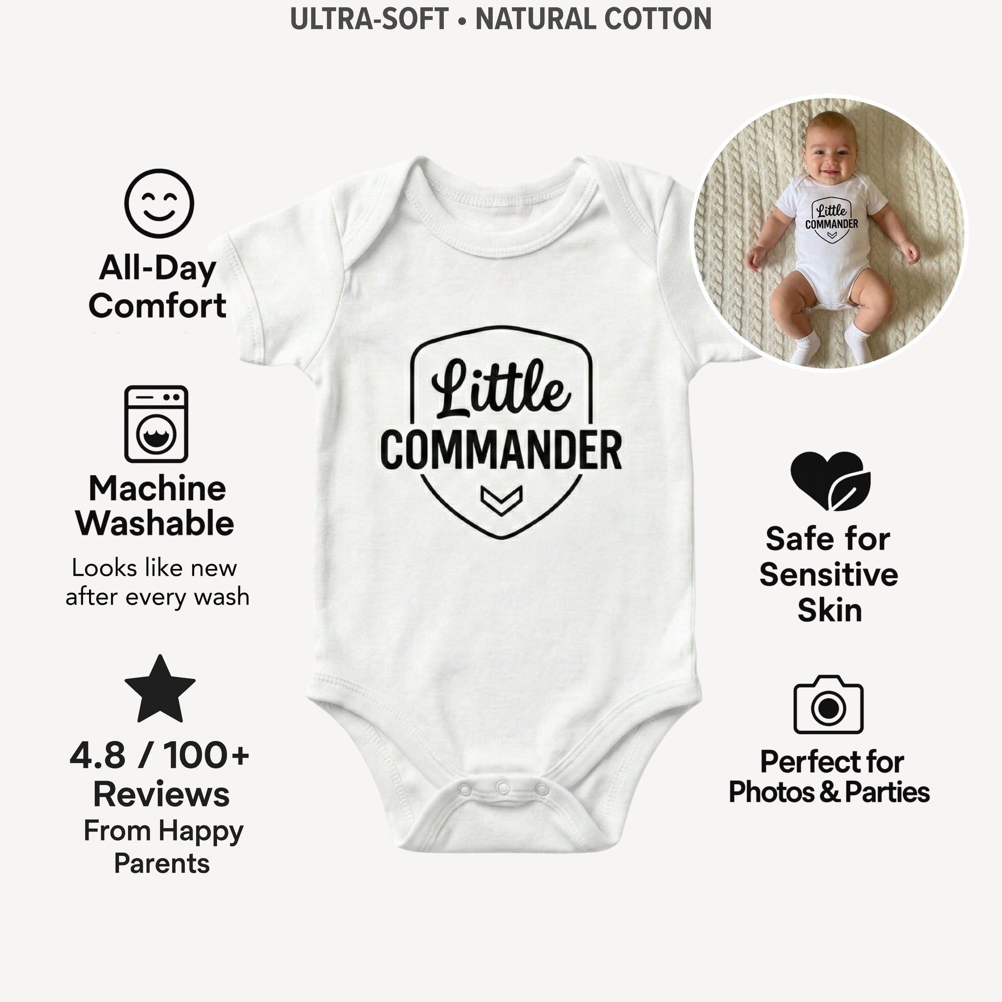 Perfect for 📸 funny photoshoots, 🧸 playdates, 🎉 first birthdays, 🍼 baby shower gifts, or everyday wear — this onesie is the ultimate mix of comfort and confident mini-boss vibes for your cutest little commander! ✨