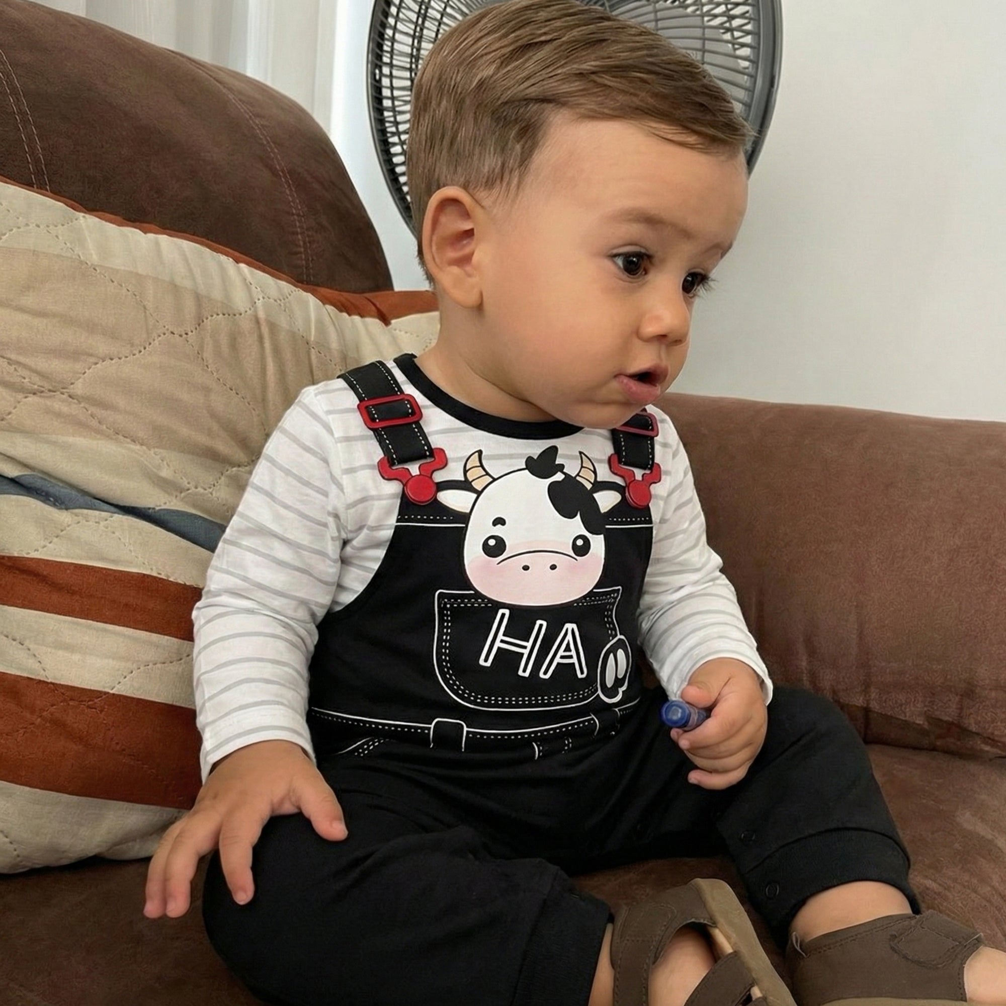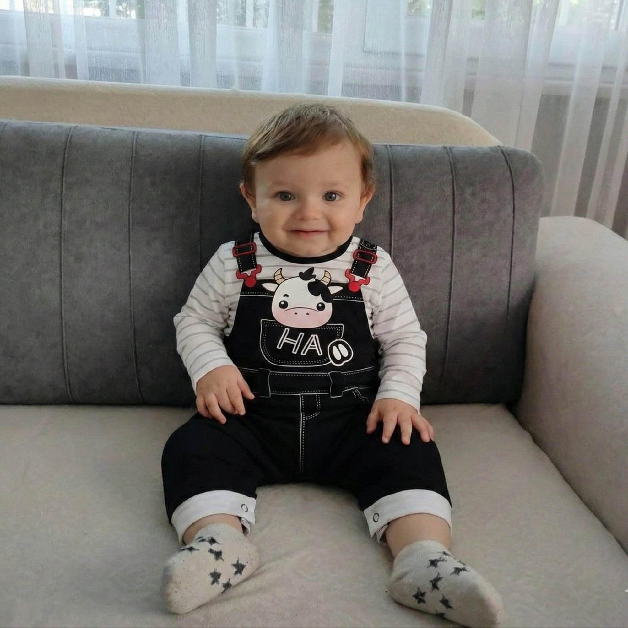 Transform everyday playtime into a charming little countryside moment with this cow-inspired romper — perfect for keeping your tiny cutie comfy, cozy, and ready for cuddles, even on cooler days. The stylish overall look, classic stripes, and adorable cow face make this outfit a total showstopper for photos and family outings.