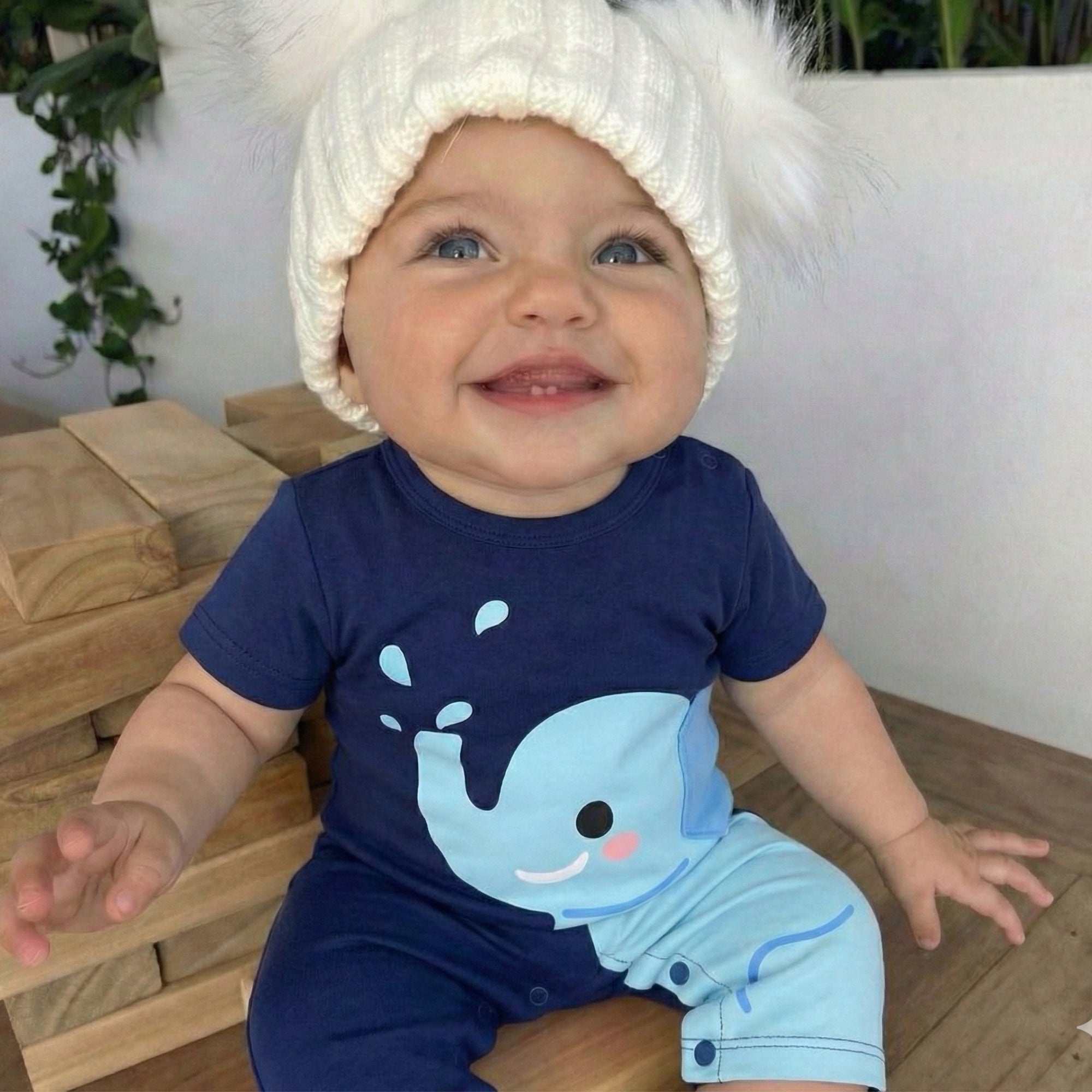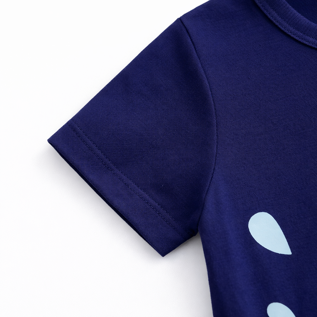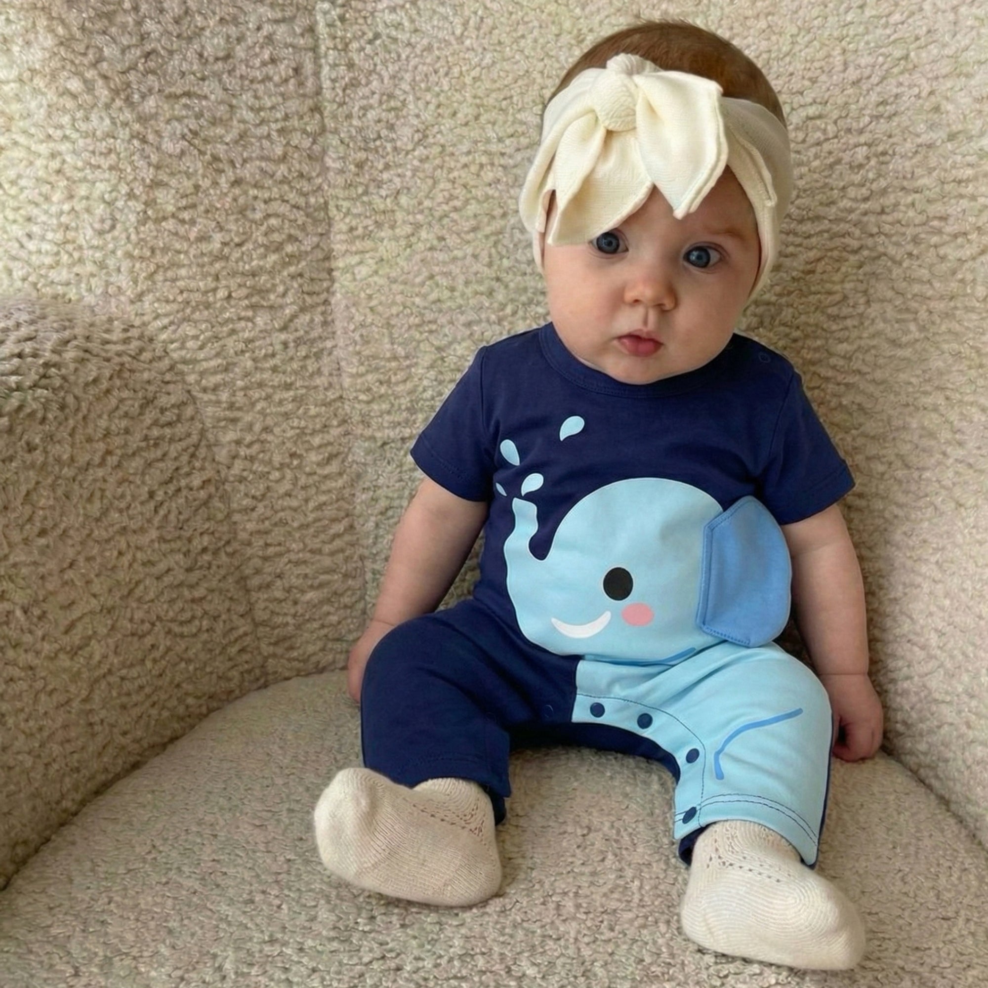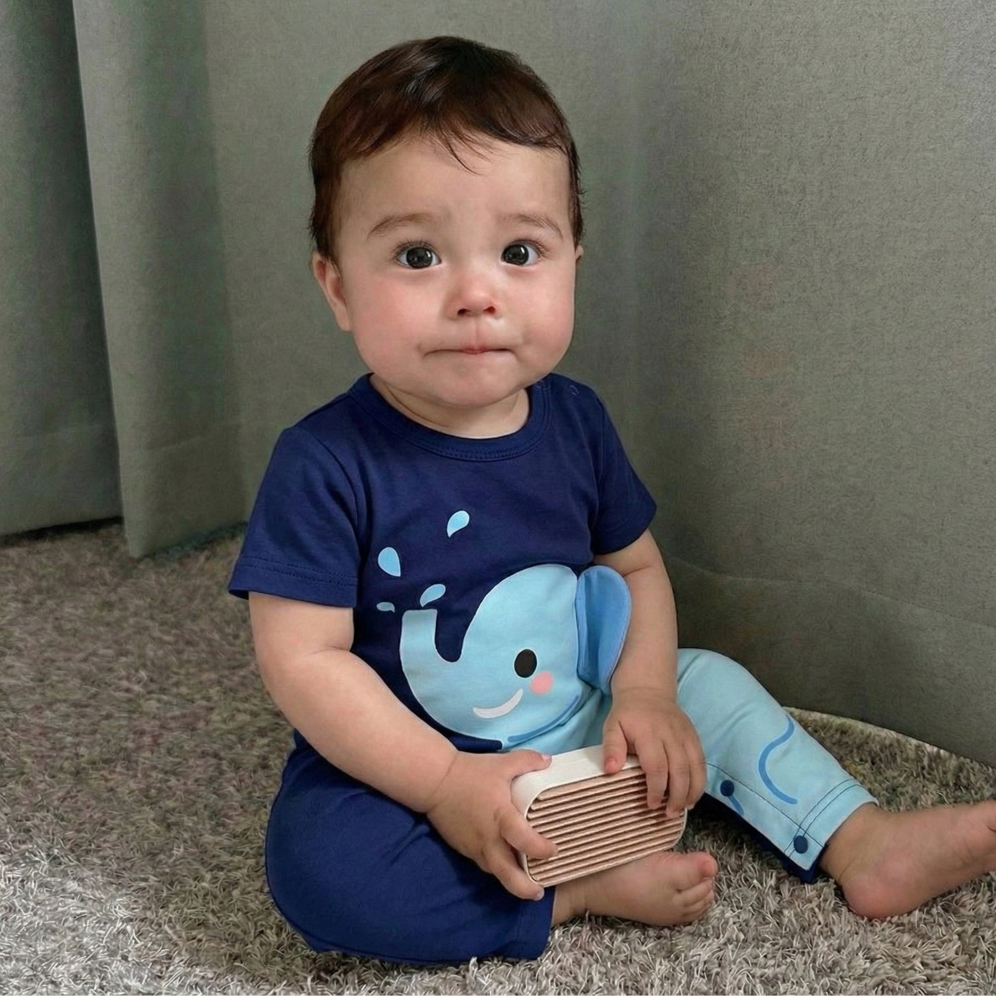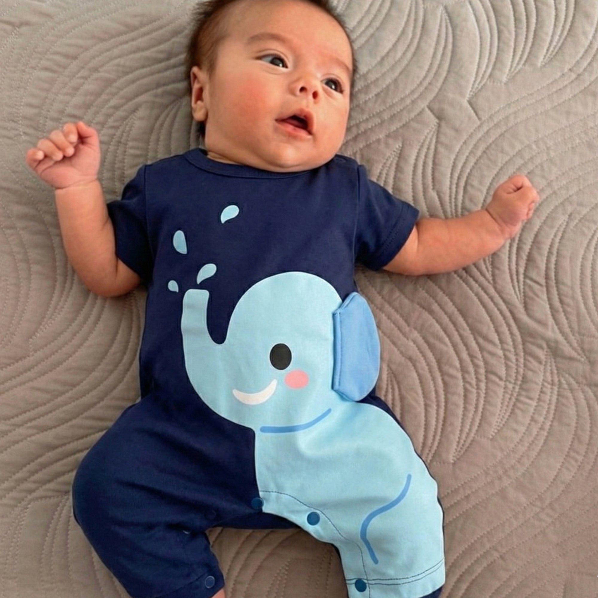 Transform everyday playtime into a gentle, giggly safari moment with this elephant-inspired romper — perfect for keeping your little cutie comfy, cozy, and ready for cuddles, even on cooler days. The deep navy base, adorable smiling elephant, and playful water-splash details make this outfit a total standout for photos and everyday outings.