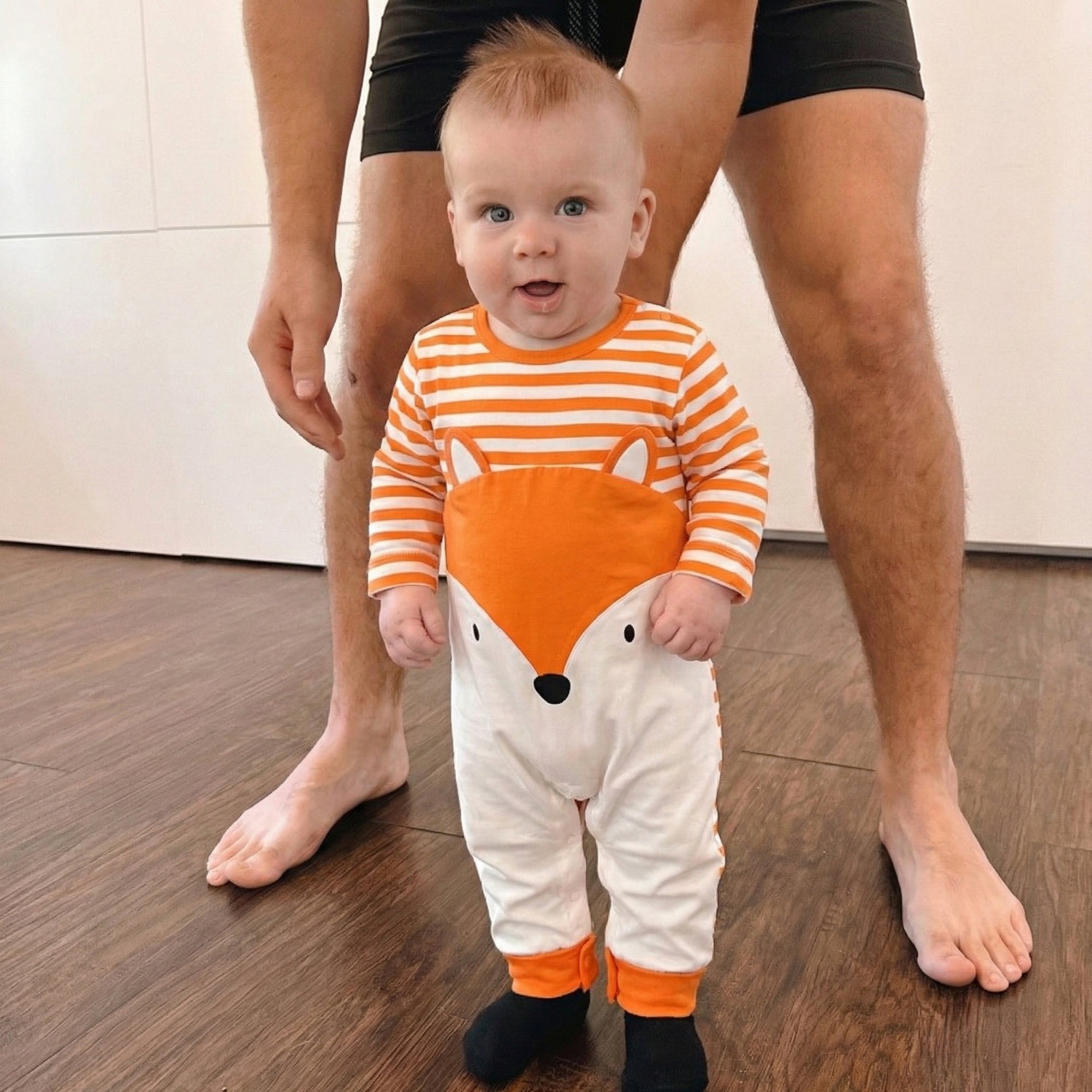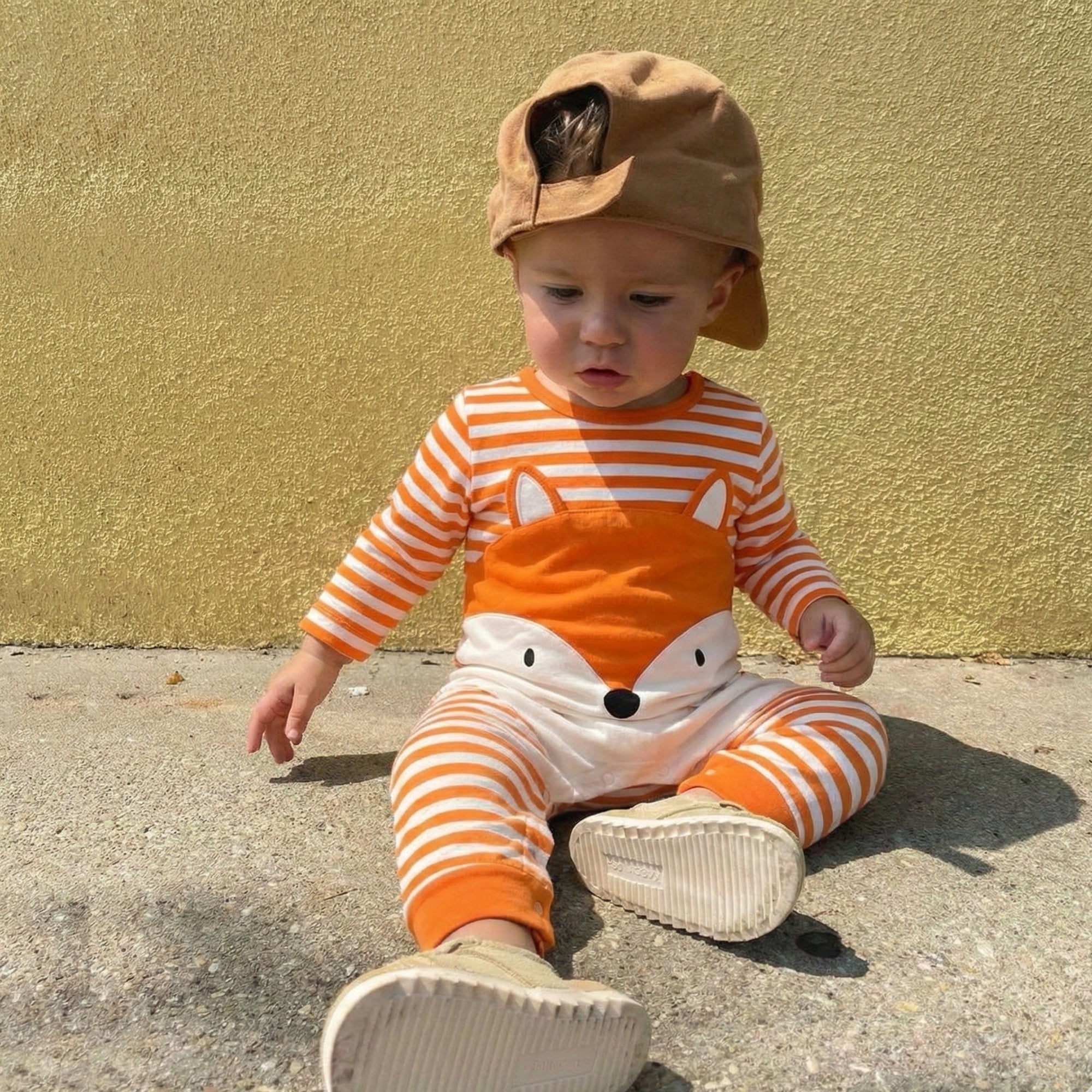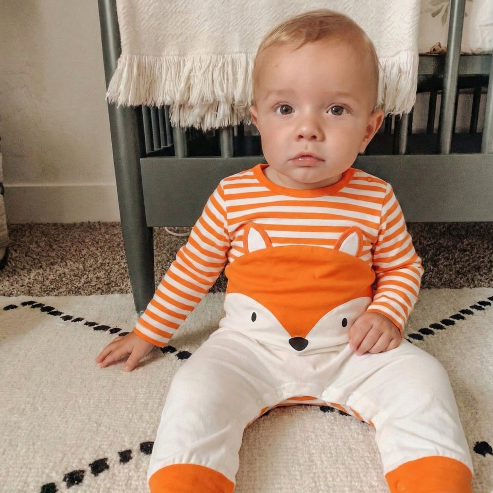 Turn everyday snuggles into a little forest adventure with this adorable fox romper — bright, playful, and made for nonstop cuddles. The sweet fox face and cheerful stripes bring instant fall vibes, while the soft, breathable fabric and comfy stretch keep your little one happy through tummy time, naps, and giggles. Easy snap closures make diaper changes quick and fuss-free, so you can focus on the cute moments.
