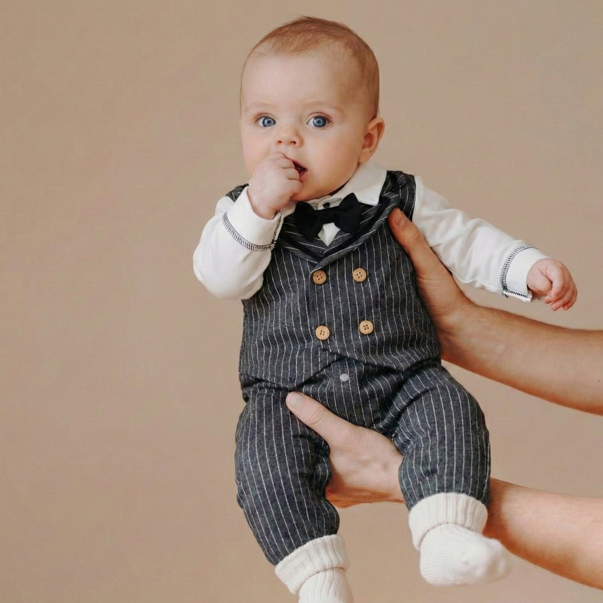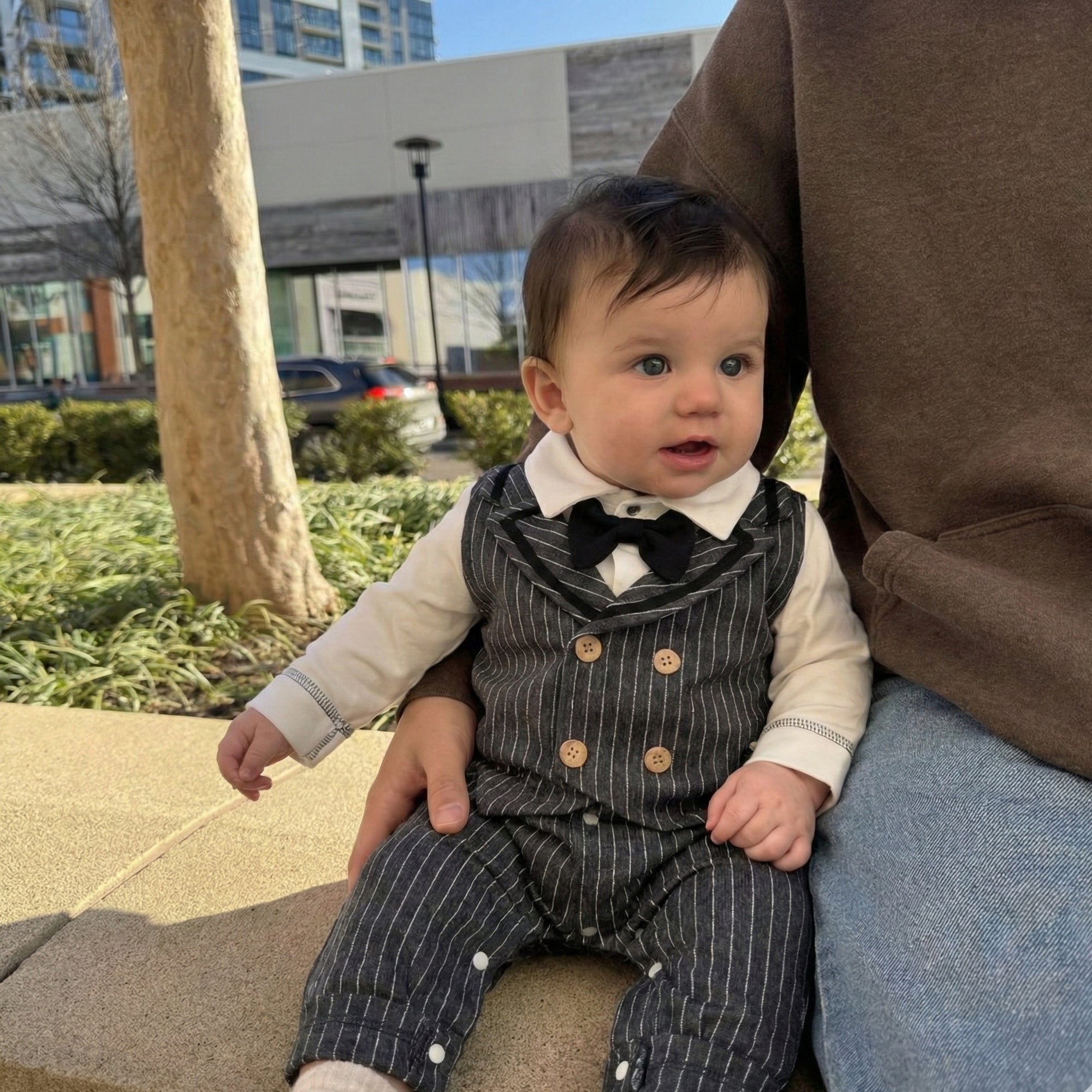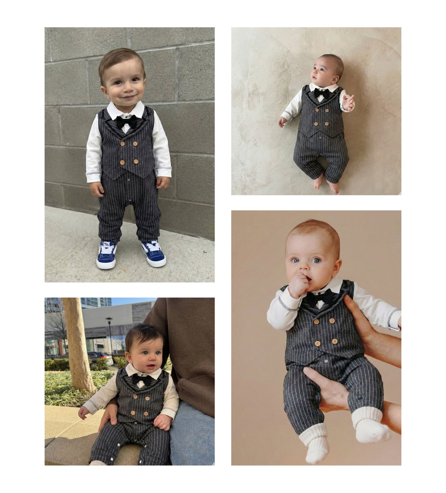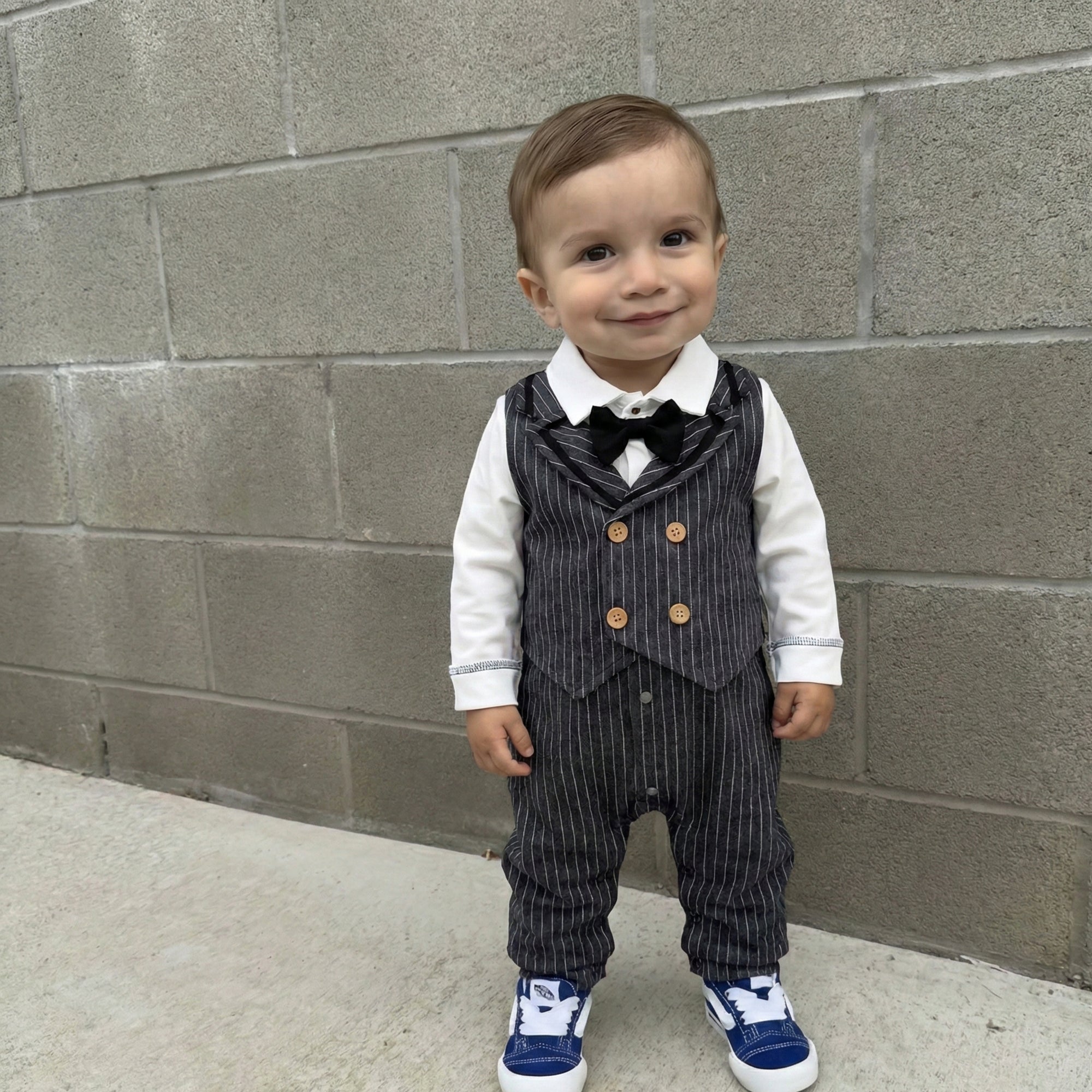 Turn everyday moments into classy little memories with this sharp pinstripe suit-style romper — comfy, cozy, and full of big “little gentleman” energy. The crisp white “shirt” look, sleek charcoal pinstripe double-breasted vest design with warm button details, and adorable black bowtie bring instant charm, while the easy, baby-friendly fit keeps your tiny star comfortable from playtime to nap time.