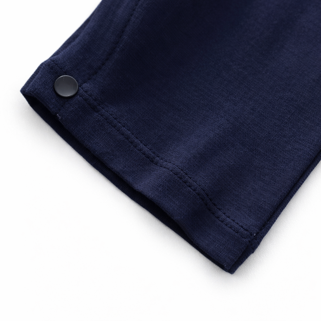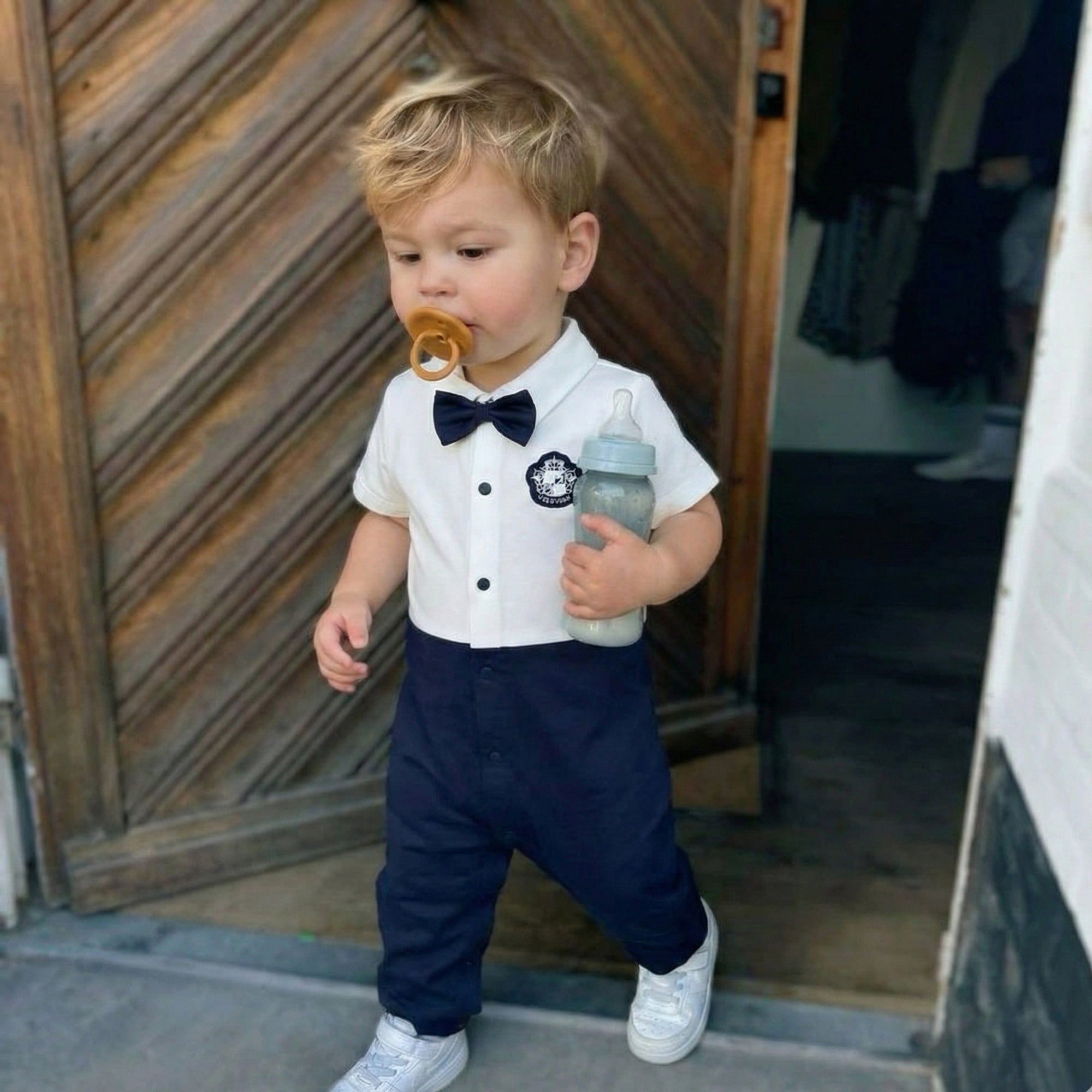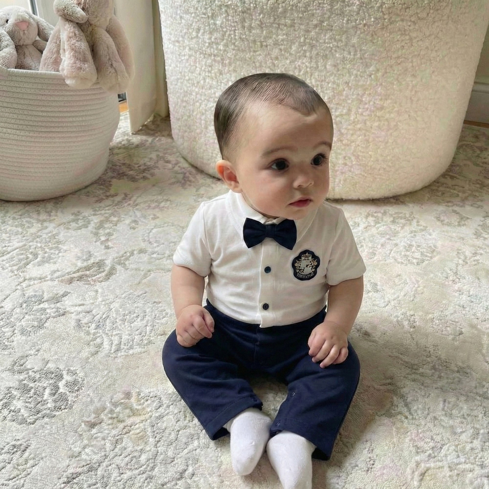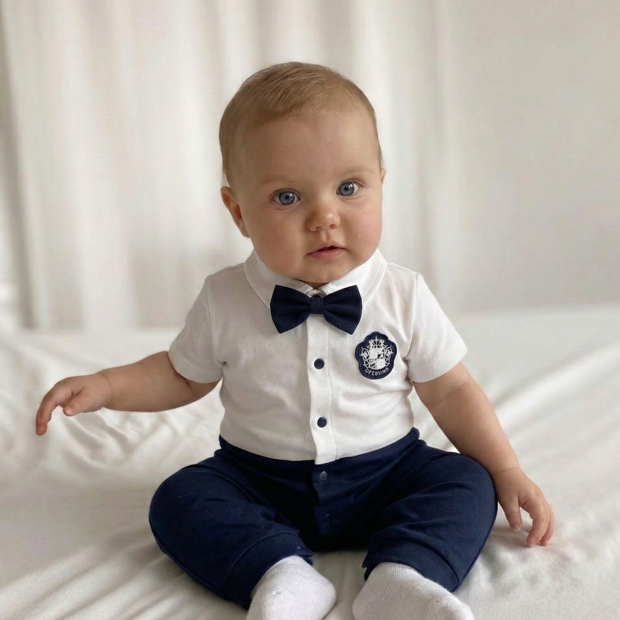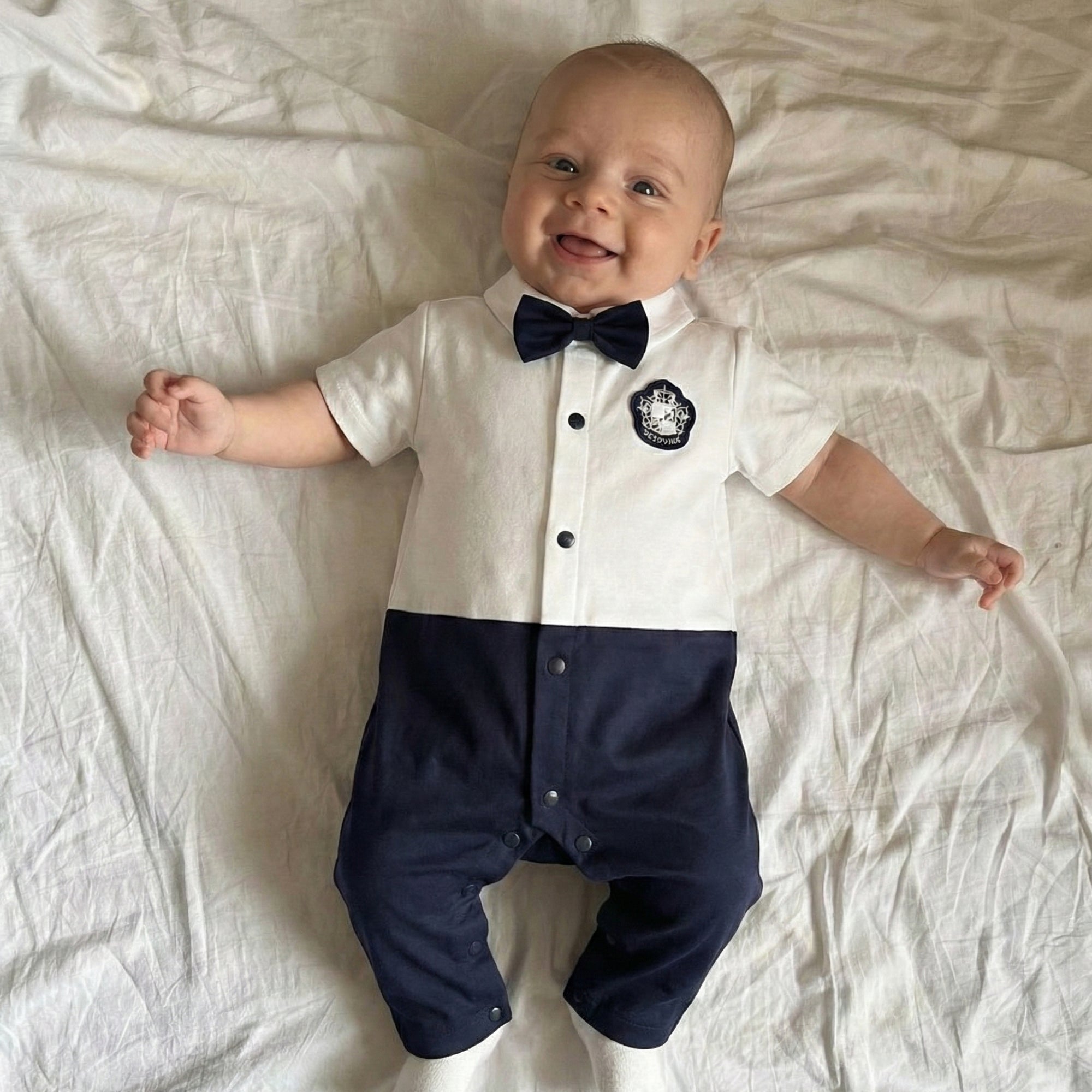 Make every day feel like a seaside adventure with this adorable nautical suit-style romper — comfy, cozy, and full of ocean charm. The crisp white “shirt” look, deep navy bottom, and cute matching bowtie + crest detail bring instant smiles, while the easy, baby-friendly fit keeps your little captain snug from playtime to nap time.