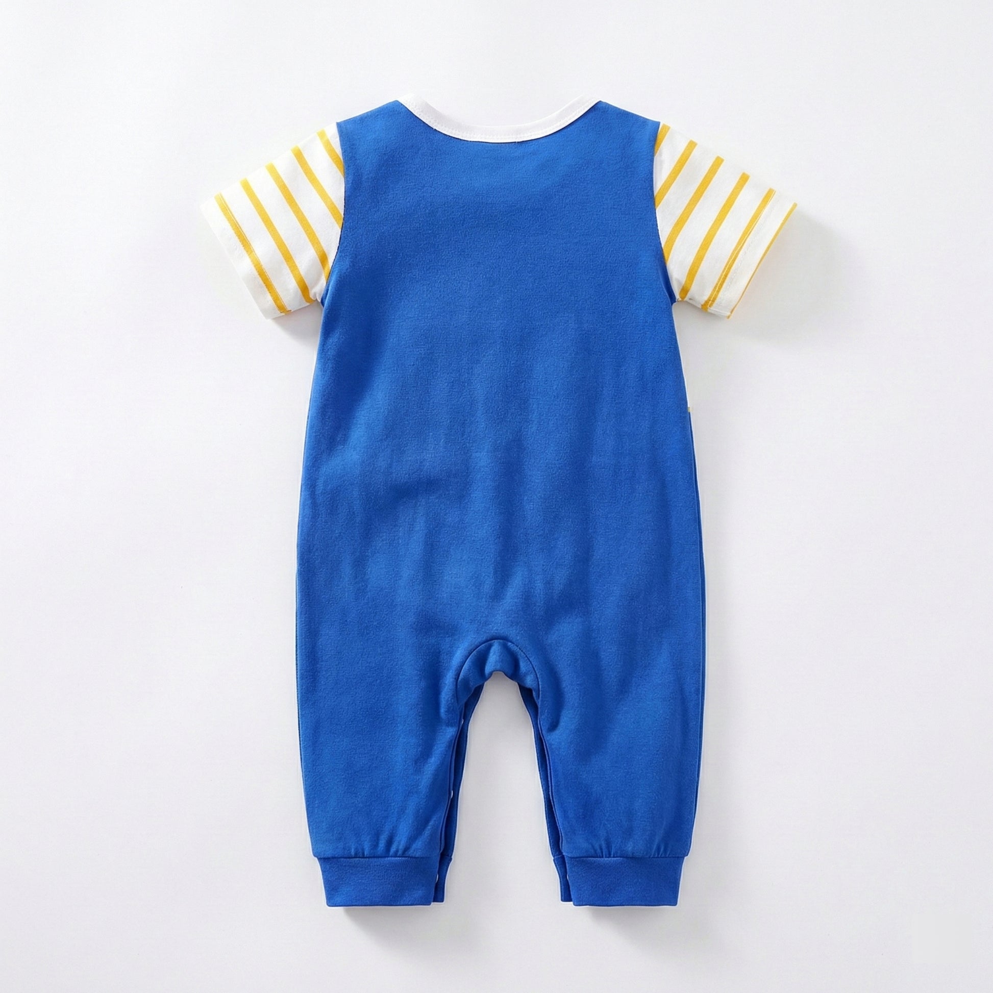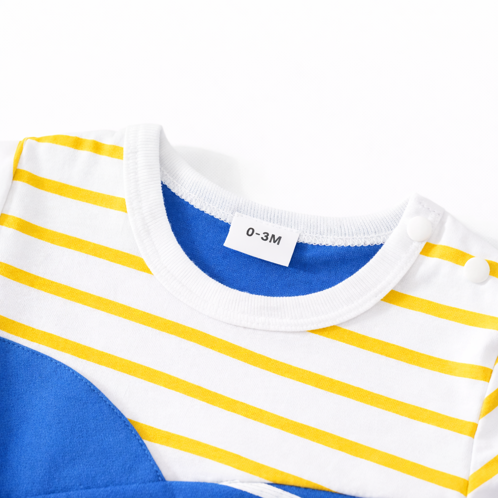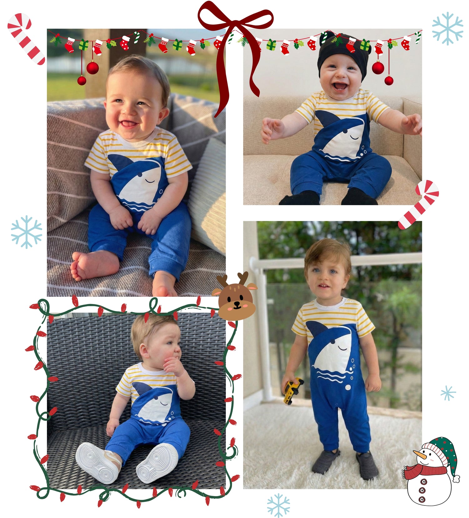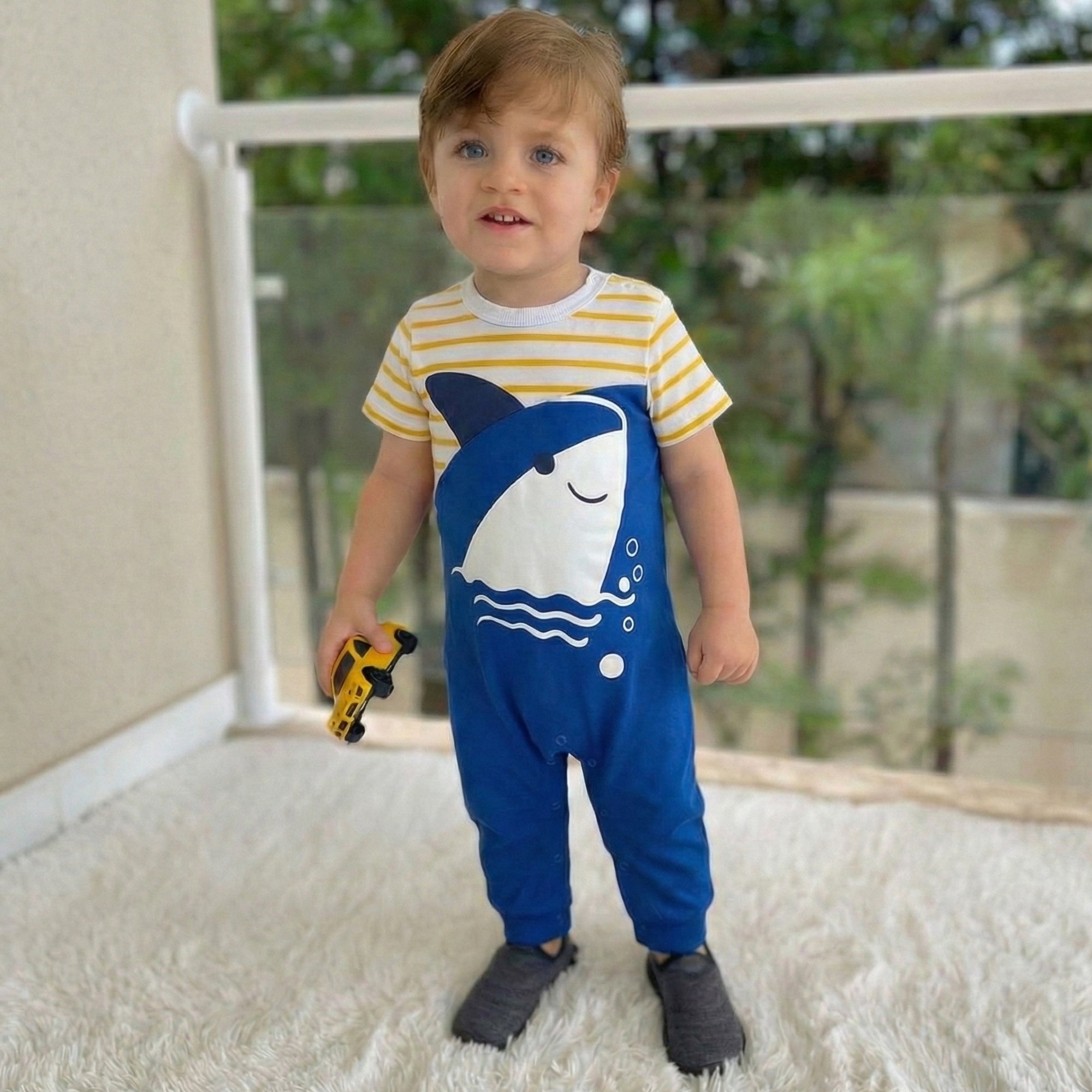 Transform everyday playtime into a splashy seaside story with this shark-inspired romper perfect for keeping your little swimmer comfy, cozy, and ready for cuddles, even on cooler days. With its bright blue tones, playful striped top, and adorable smiling shark design, this outfit is guaranteed to make your baby the star of every photo.