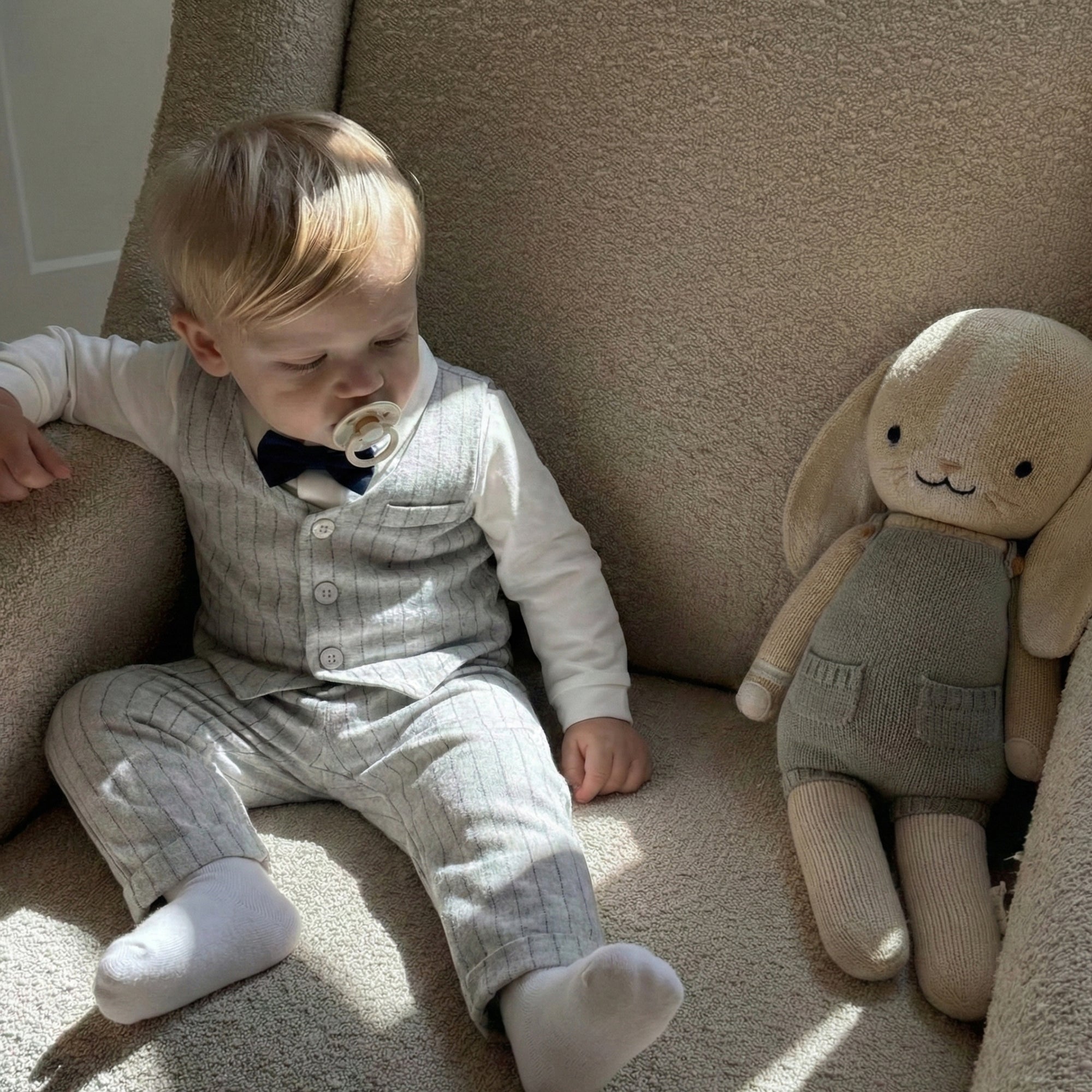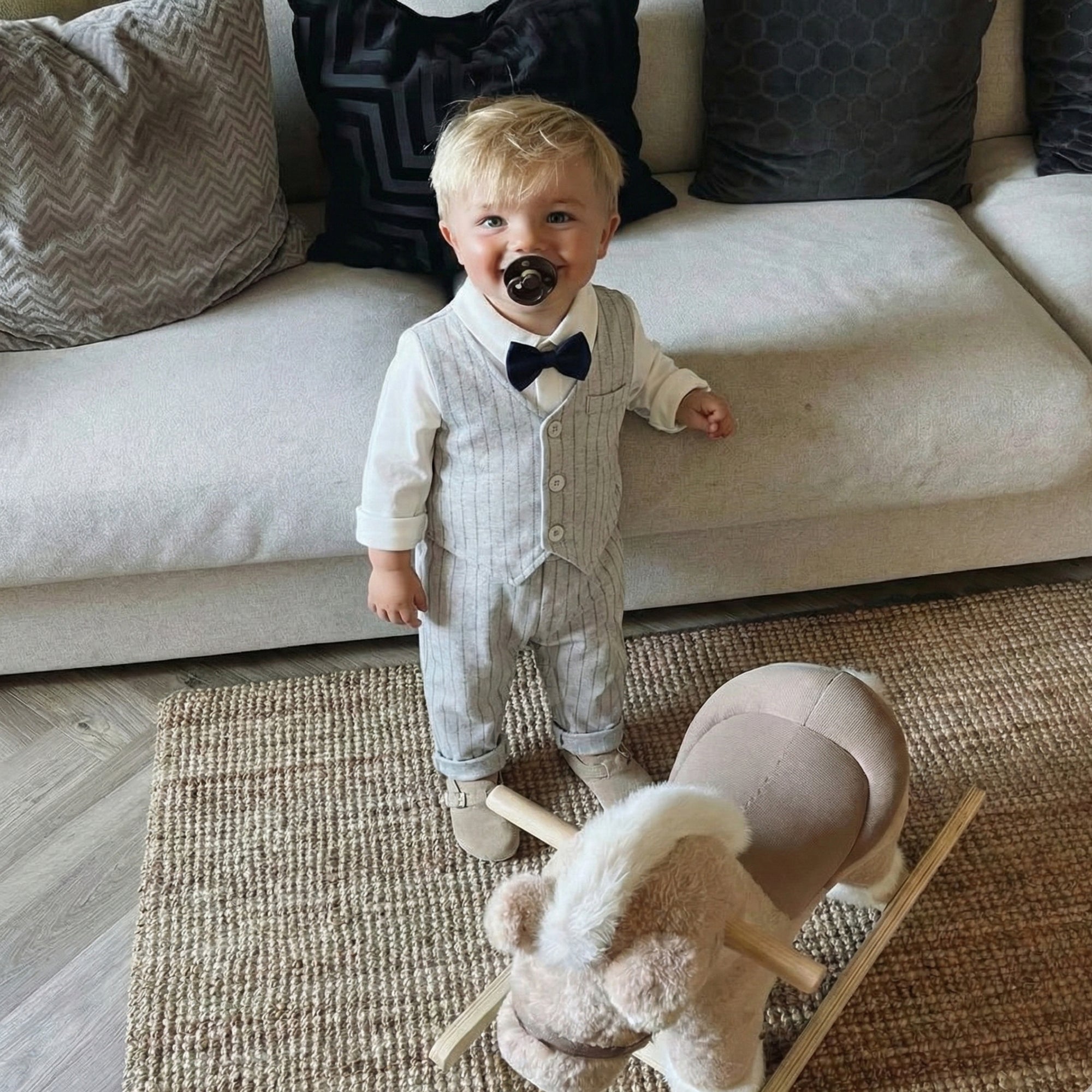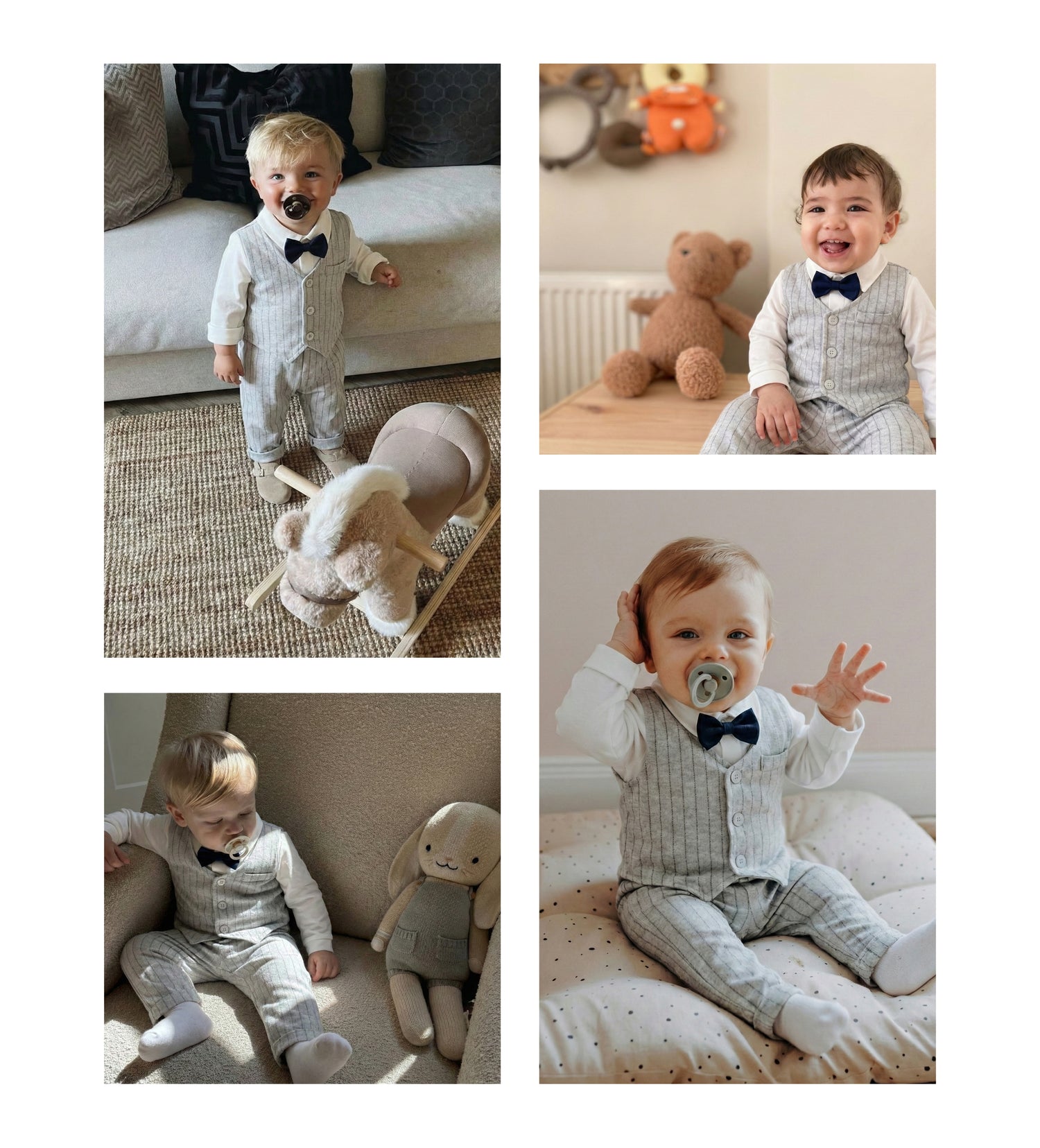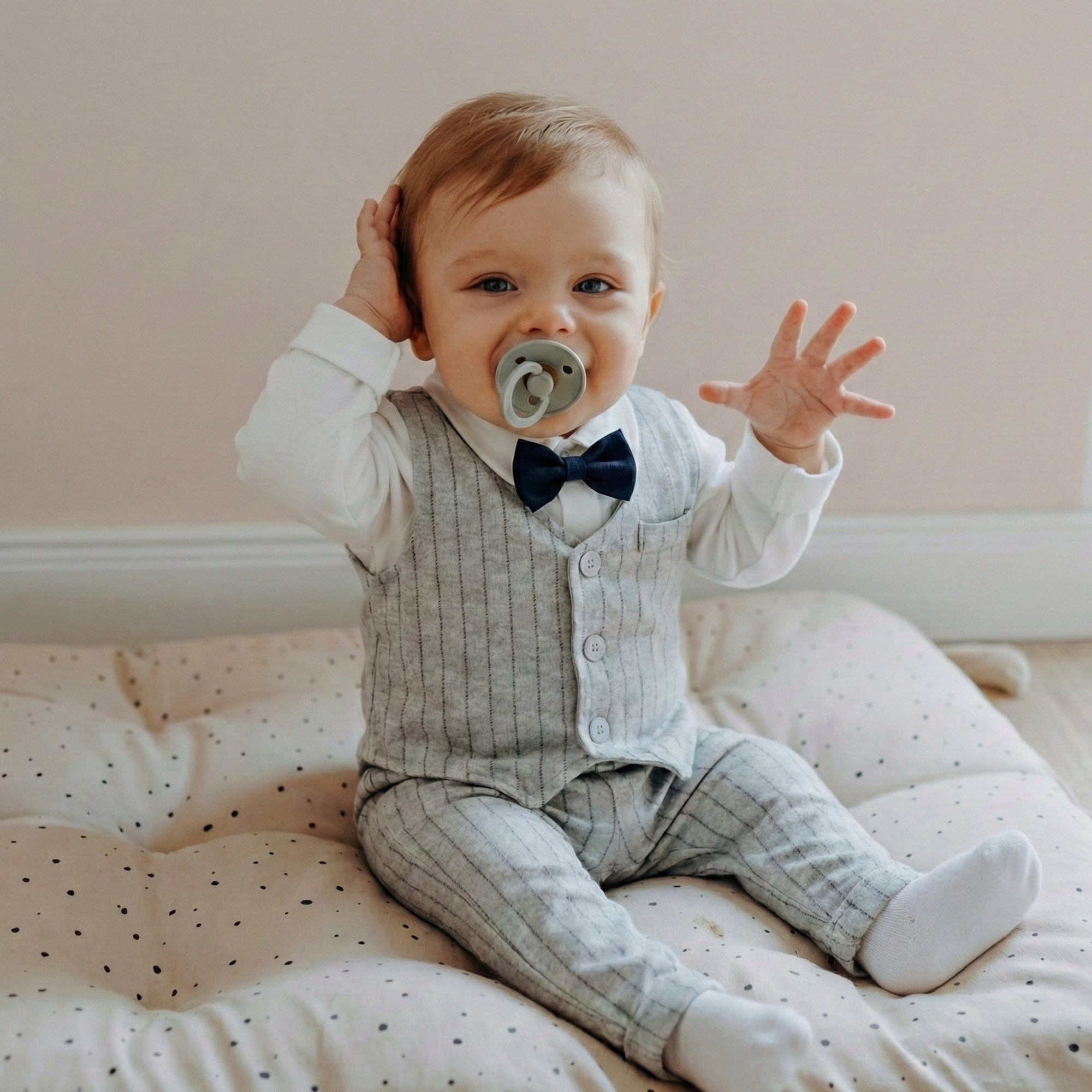 Make every day feel like a sweet little milestone with this adorable suit-style romper — comfy, cozy, and full of timeless charm. The crisp white “shirt” look, elegant light gray pinstripe vest-and-pants design, and cute navy bowtie add instant gentleman vibes, while the easy, baby-friendly fit keeps your little one snug from cuddles to nap time.