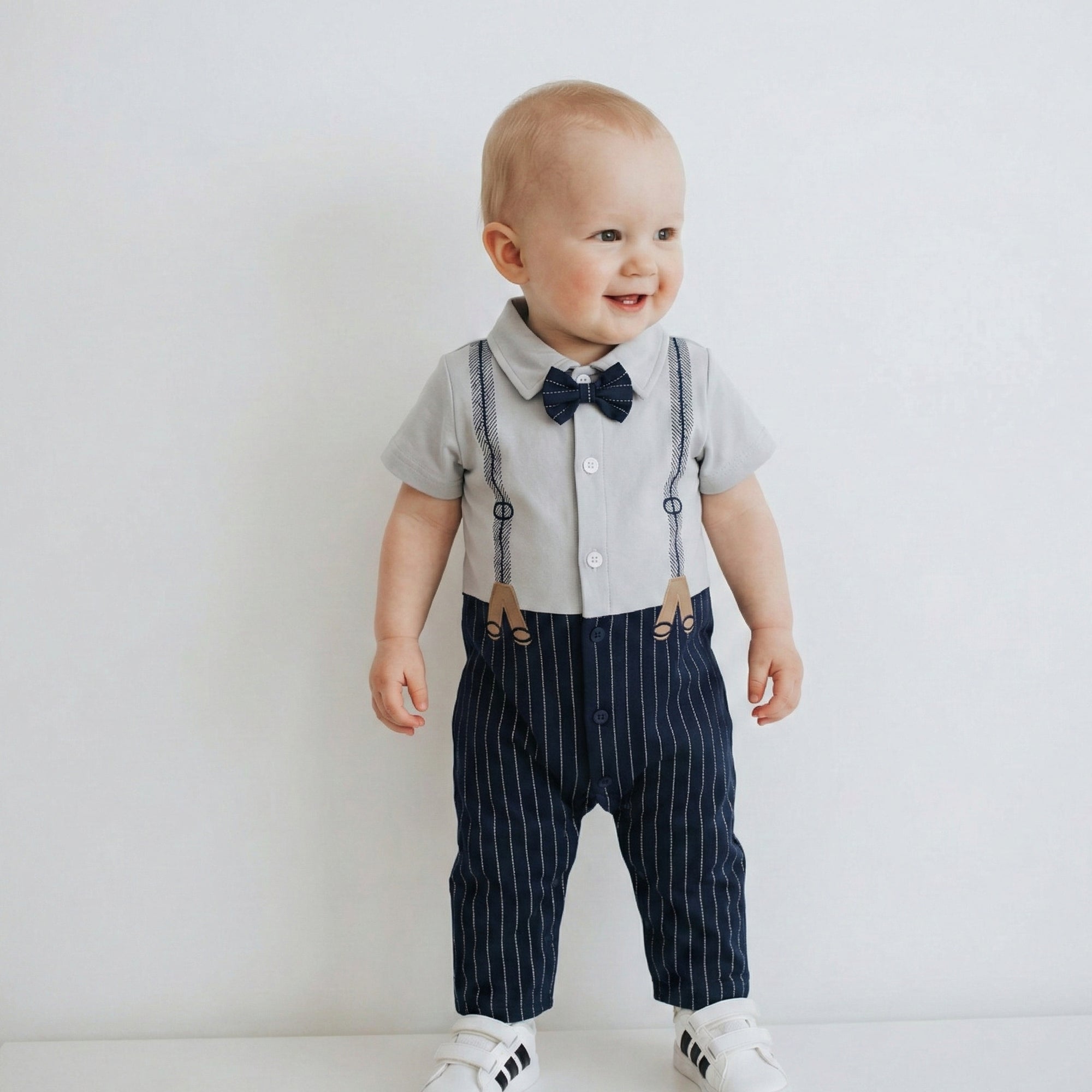 Make every day feel like a special occasion with this adorable suspenders-and-bowtie romper — comfy, lightweight, and full of classic charm. The crisp shirt look, pinstripe “pants” design, and sweet little bowtie bring instant smiles, while the easy, baby-friendly fit keeps your tiny gentleman cozy from playtime to picture time.
