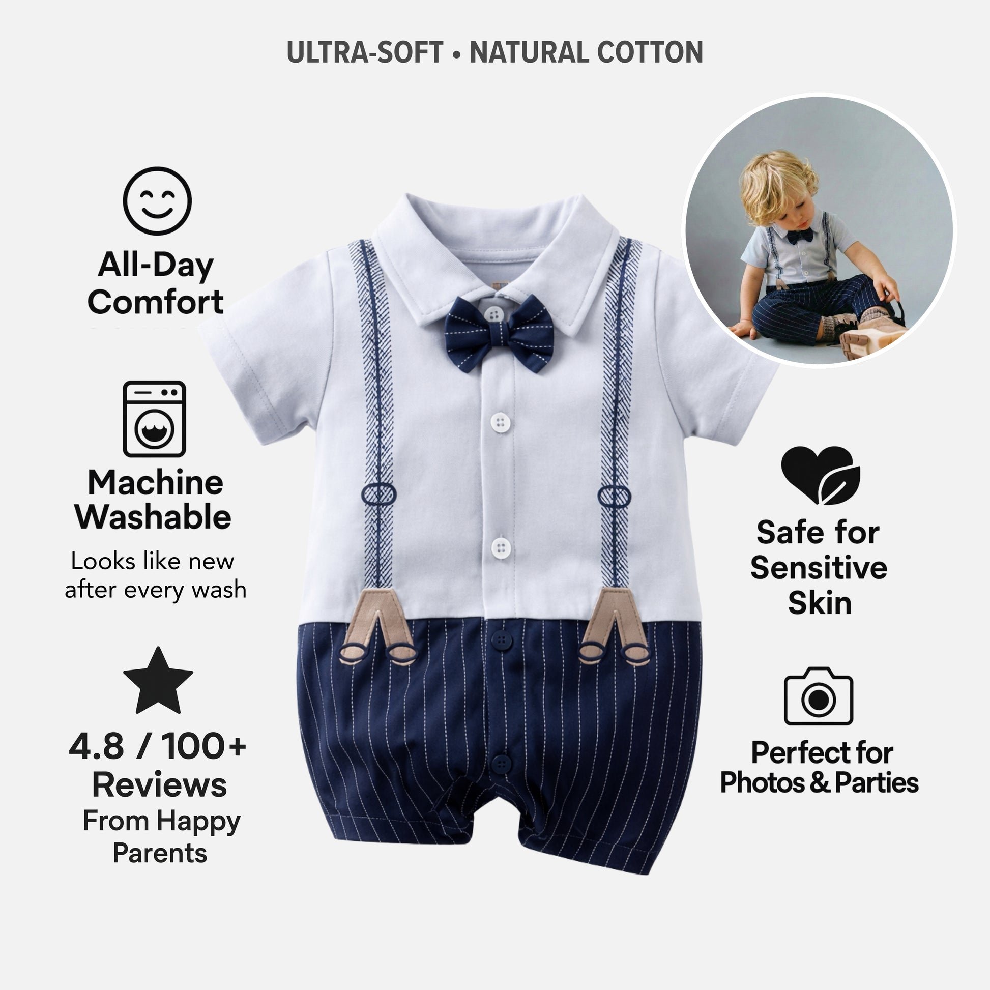 Perfect for 🎉 birthdays, 📸 milestone photos, 👨‍👩‍👧‍👦 family gatherings, ✨ weddings, 🍼 baby showers, or 🎁 as a stylish gift — this romper is the perfect mix of comfort, cuteness, and timeless gentleman vibes for your little star! 🌟
