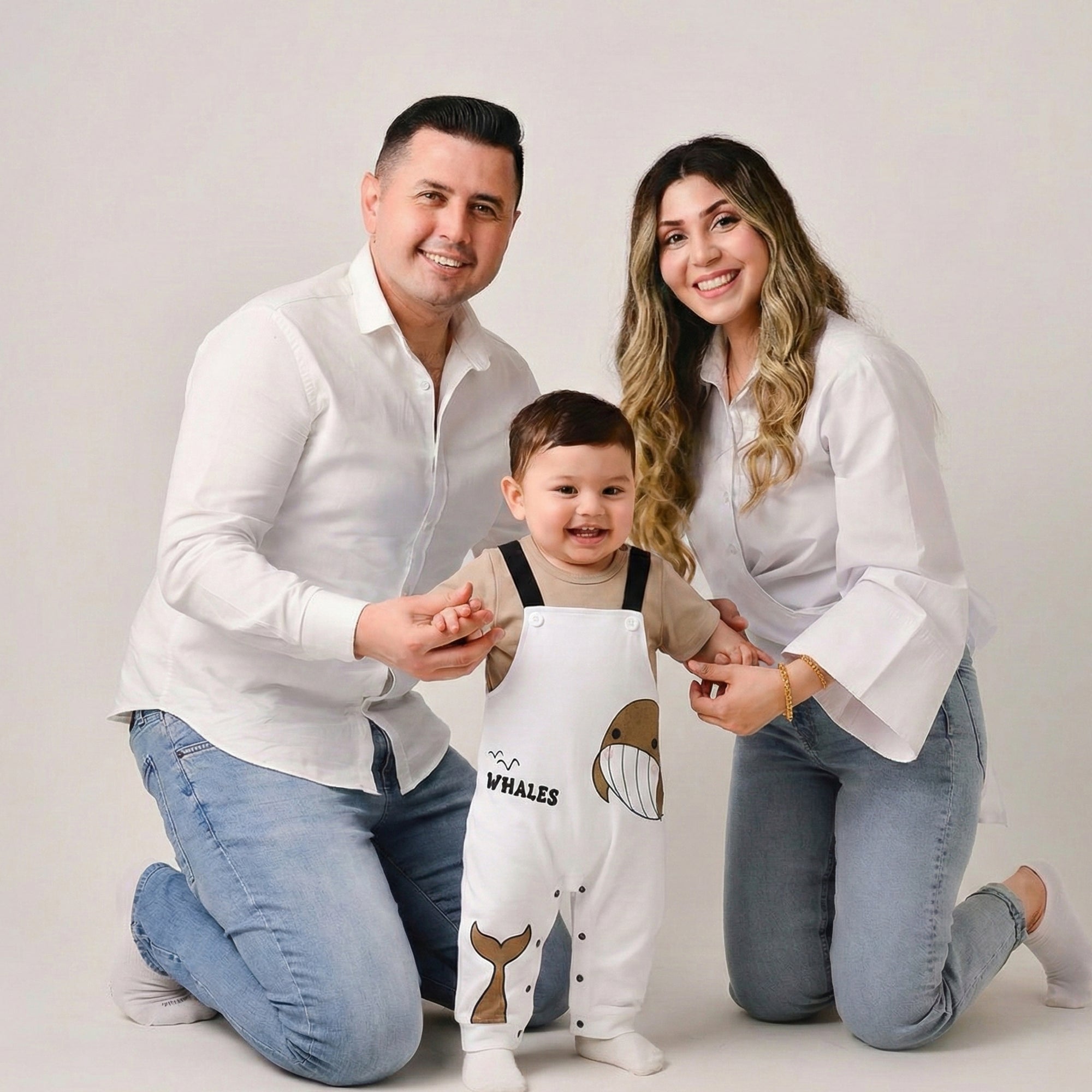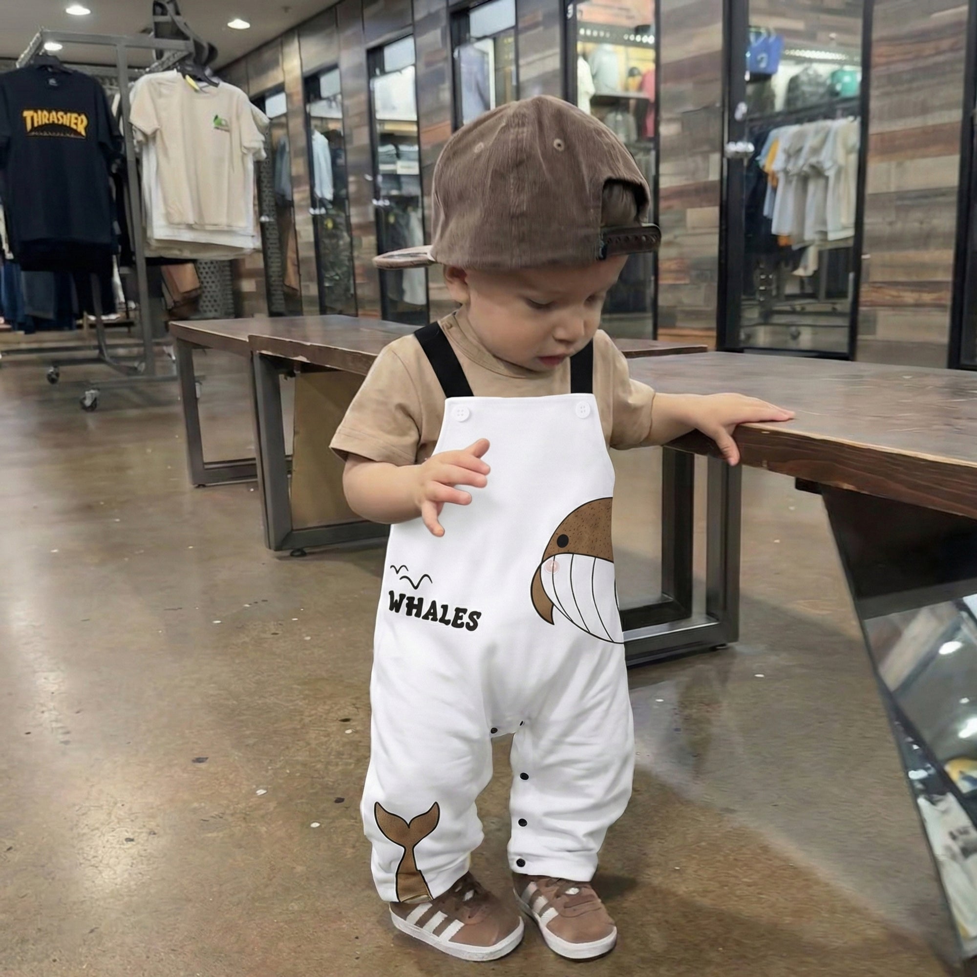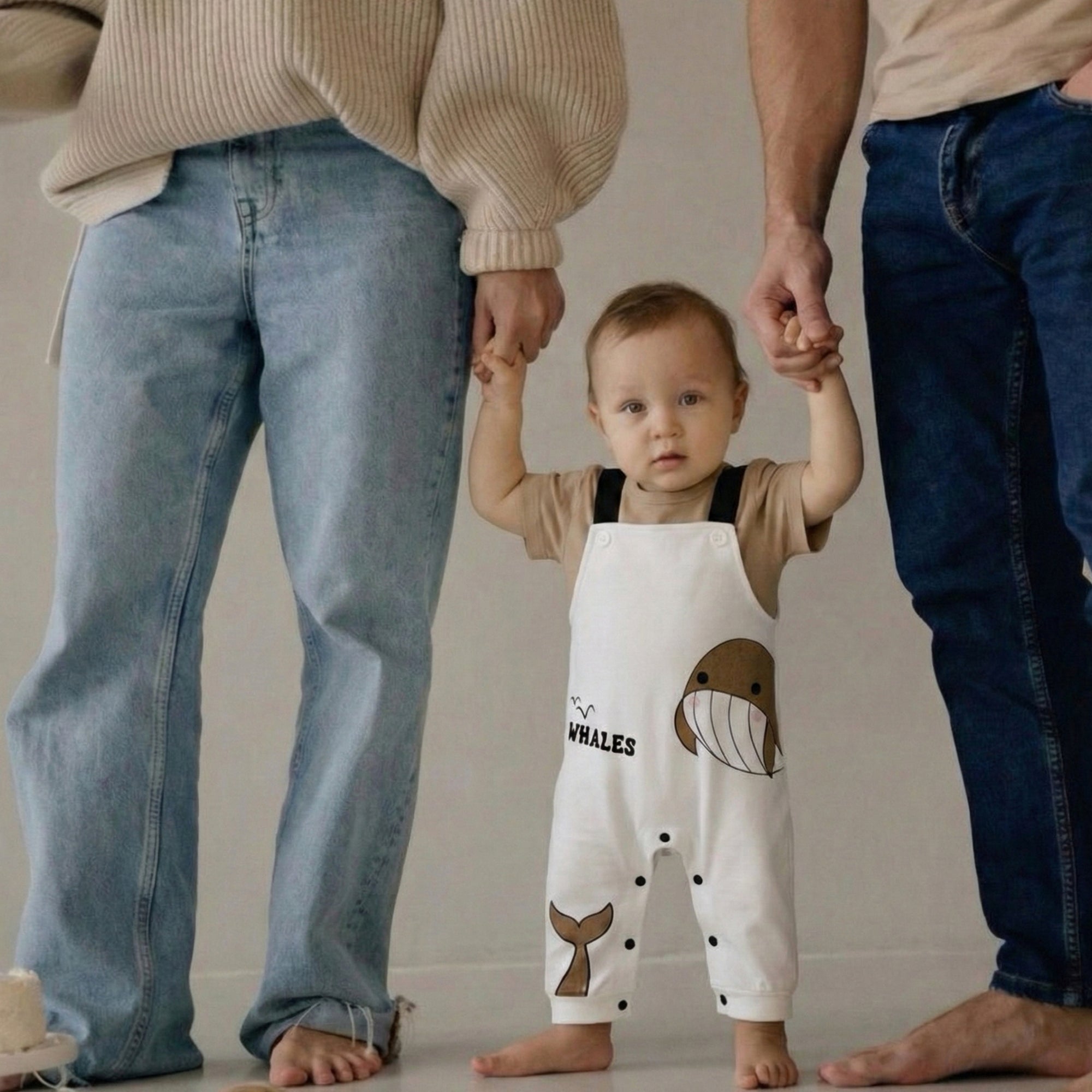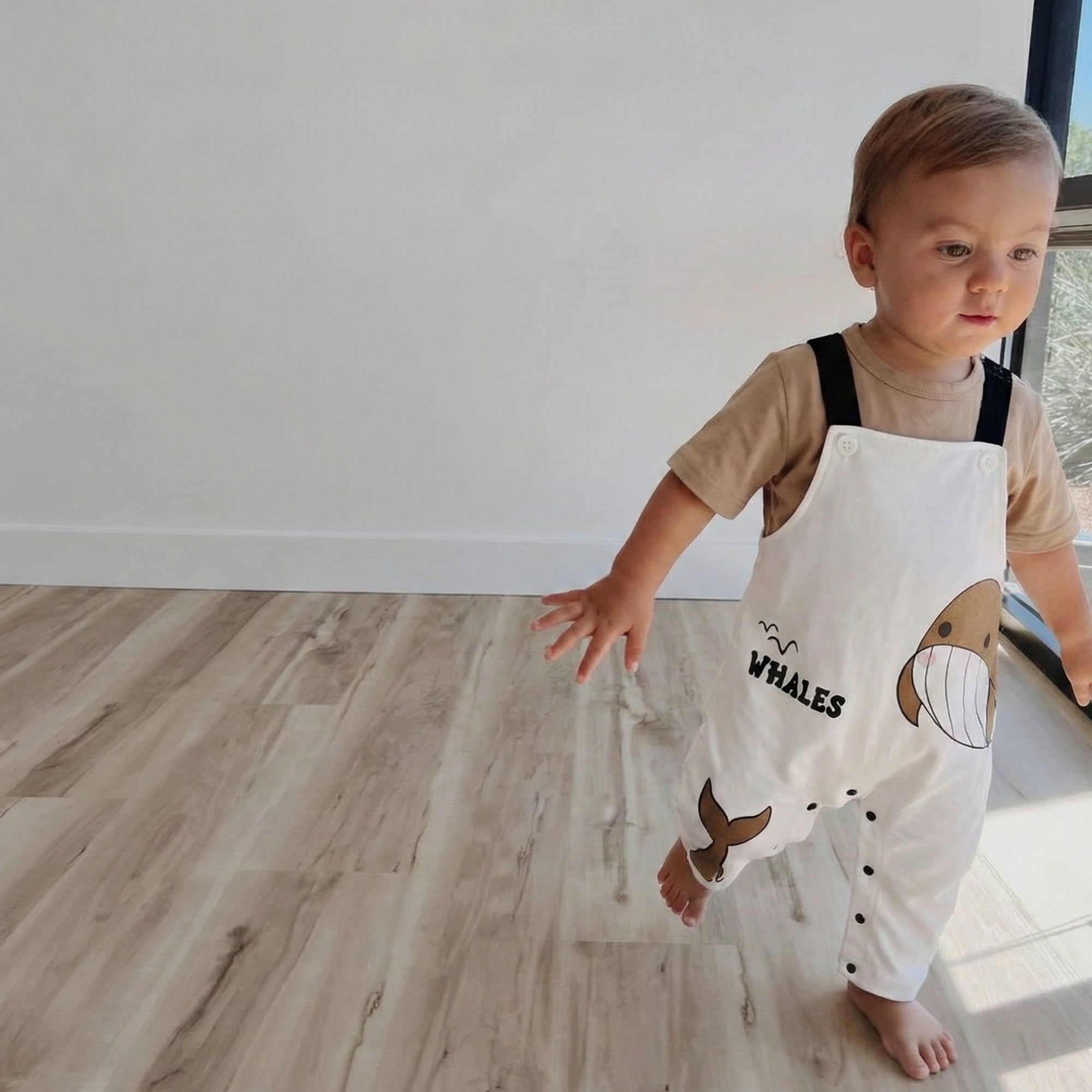 Transform everyday playtime into a cozy seaside story with this whale-inspired romper set — perfect for keeping your little one comfy, cute, and ready for snuggles, even on cooler days. The adorable smiling whale print, soft neutral tones, and overall-style look make it a go-to outfit for home days, stroller walks, and picture-perfect moments.