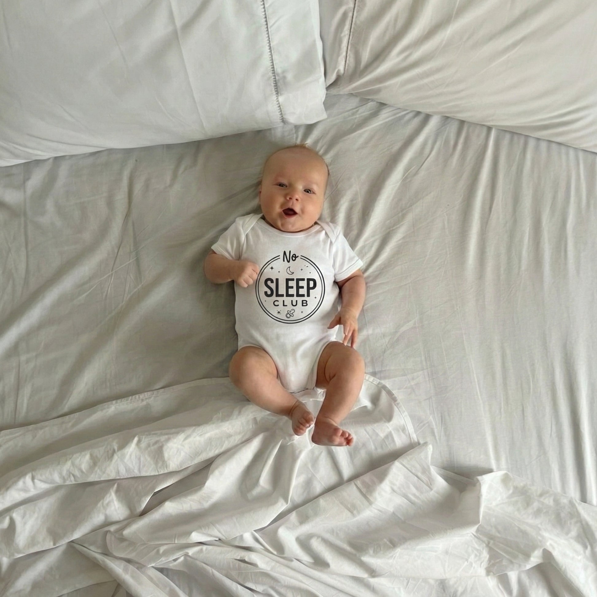 Welcome to the “No Sleep Club” — where tiny members run on cuddles, milk, and midnight energy. This funny white bodysuit is perfect for your little night owl who turns bedtime into party time. Made from ultra-soft, breathable cotton with a comfy stretch, it keeps your baby cozy through late-night snuggles, early-morning wakeups, and all the “I’m not sleepy!” moments. The clean black print pops on bright white fabric, and the easy snap closures make diaper changes fast and stress-free.
