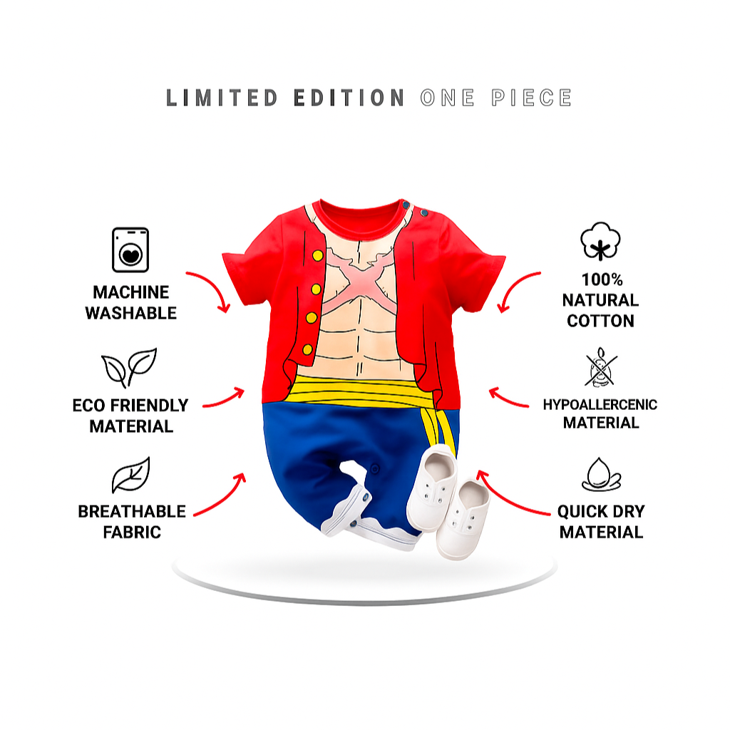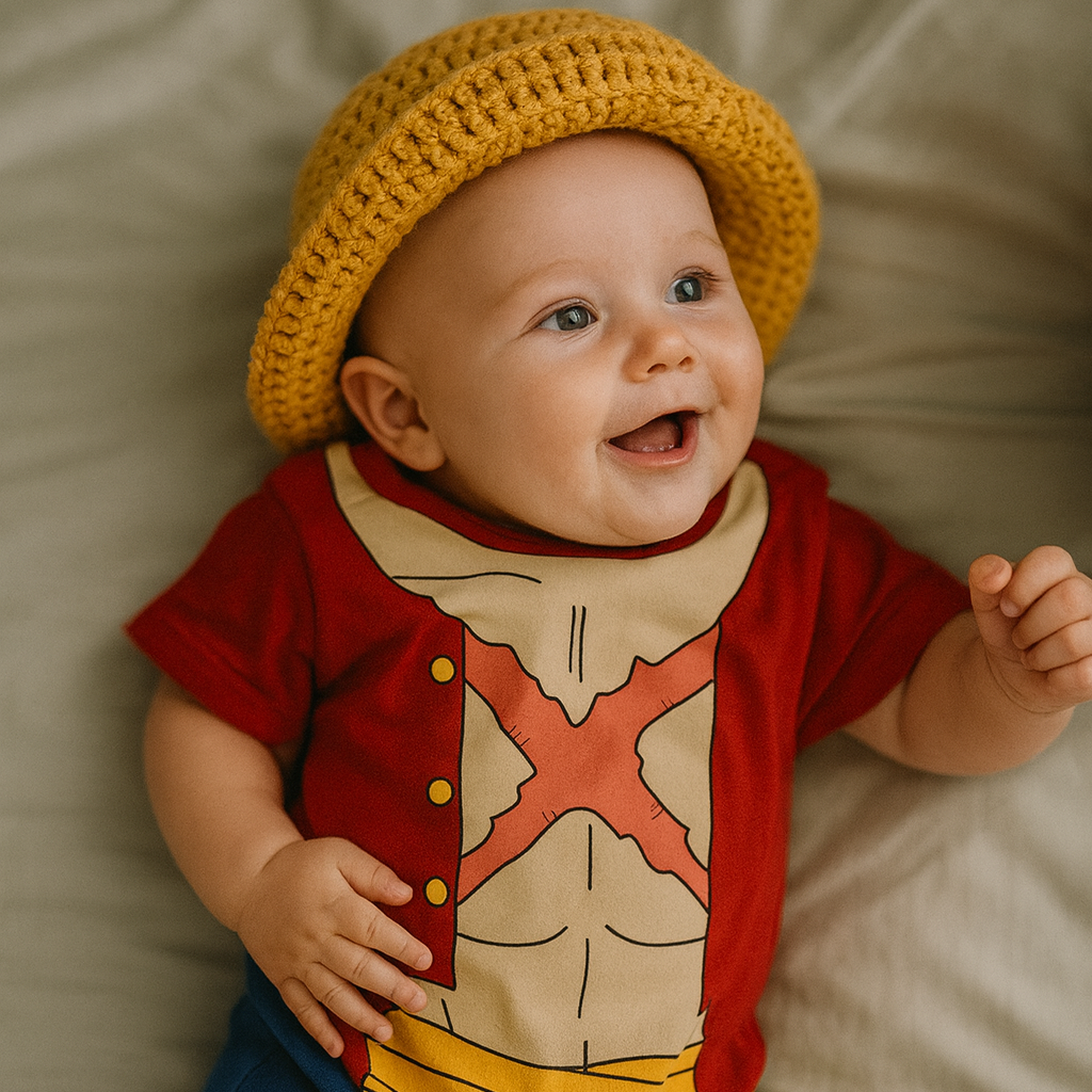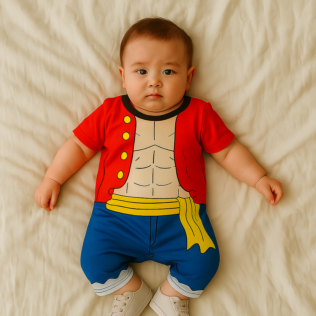 Dress your little one in a vibrant red romper inspired by Luffy from One Piece. Made from ultra-soft, breathable cotton with a comfortable stretch, it keeps your baby happy whether they’re exploring, playing, or napping. Bold, fade-resistant colors and playful details bring Luffy’s adventurous spirit to life, while durable stitching ensures it stays shipshape wash after wash.