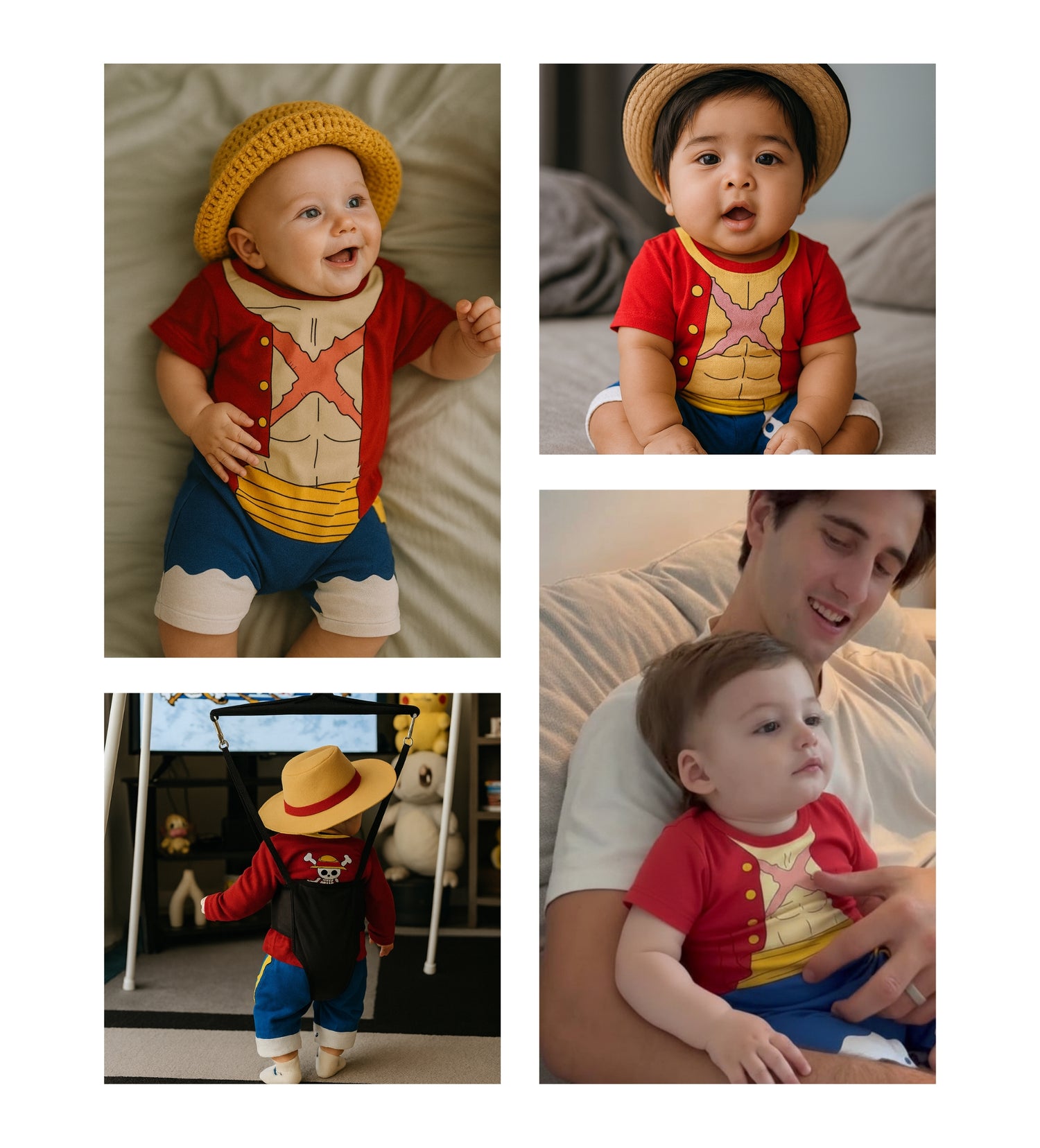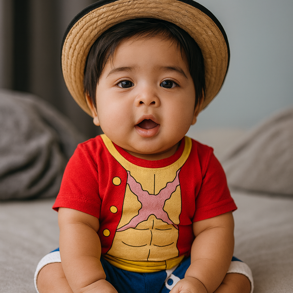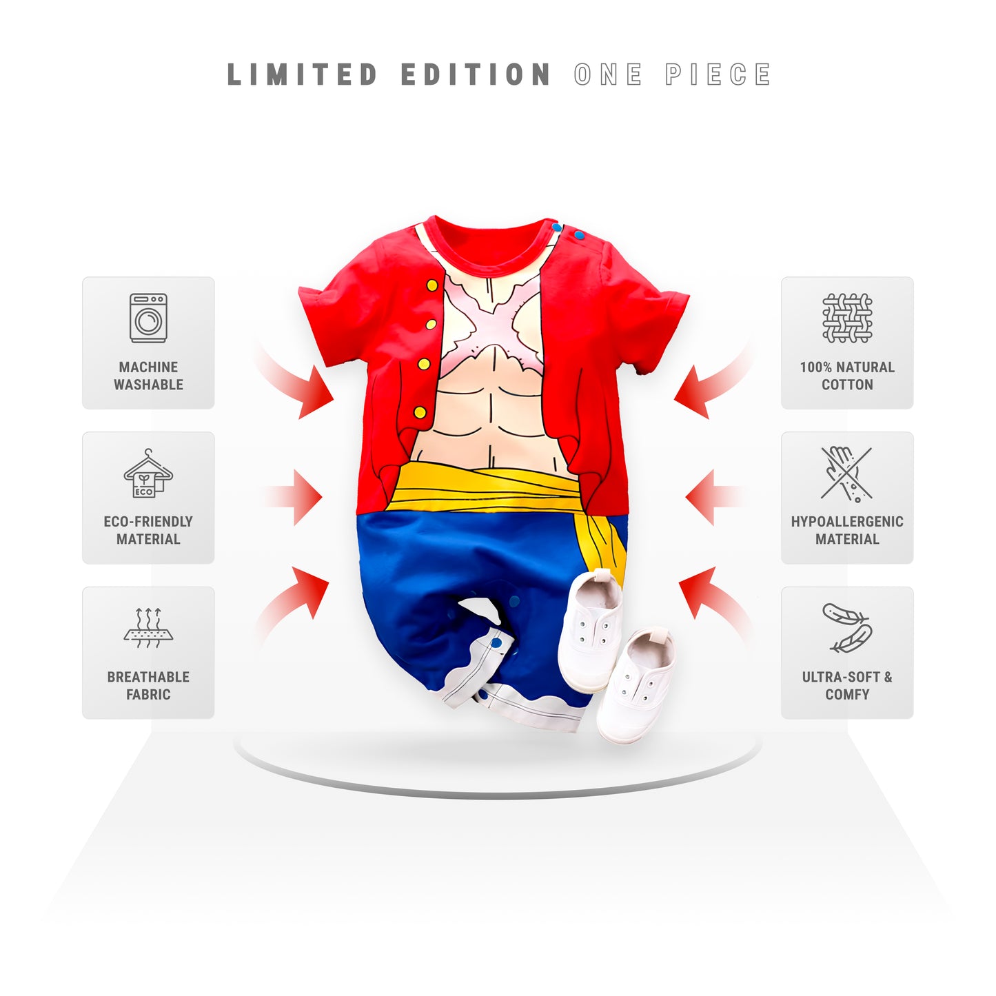 Dress your little one in a vibrant red romper inspired by Luffy from One Piece. Made from ultra-soft, breathable cotton with a comfortable stretch, it keeps your baby happy whether they’re exploring, playing, or napping. Bold, fade-resistant colors and playful details bring Luffy’s adventurous spirit to life, while durable stitching ensures it stays shipshape wash after wash.