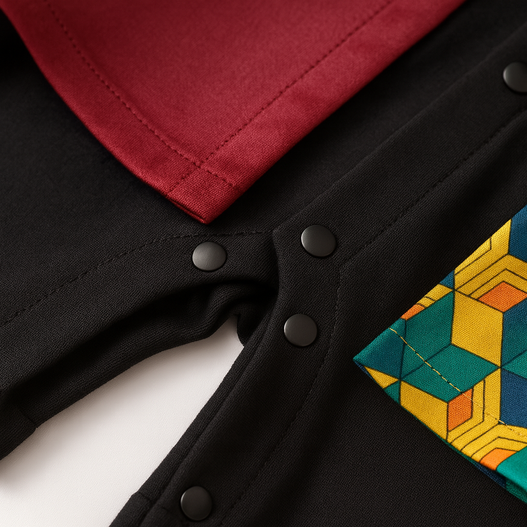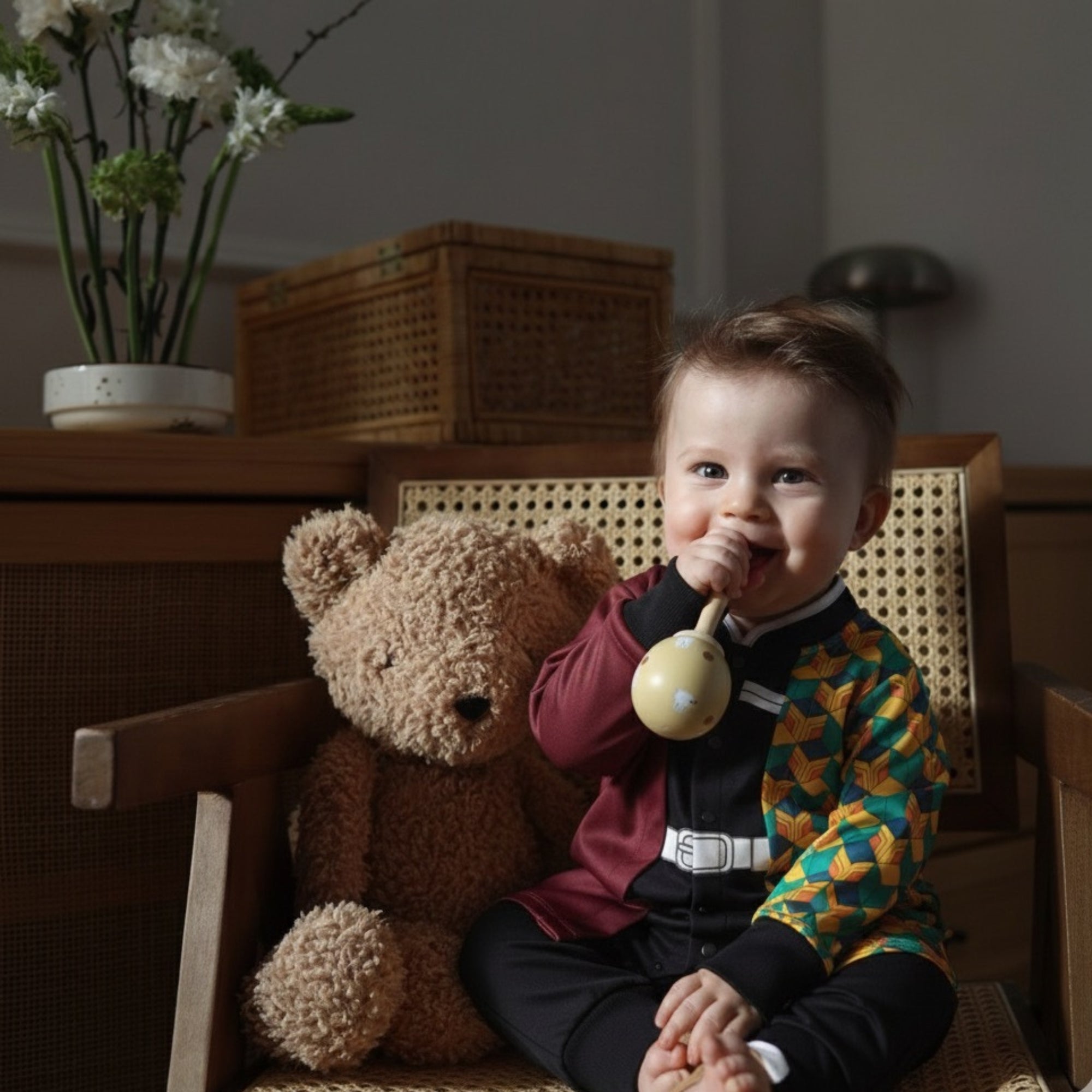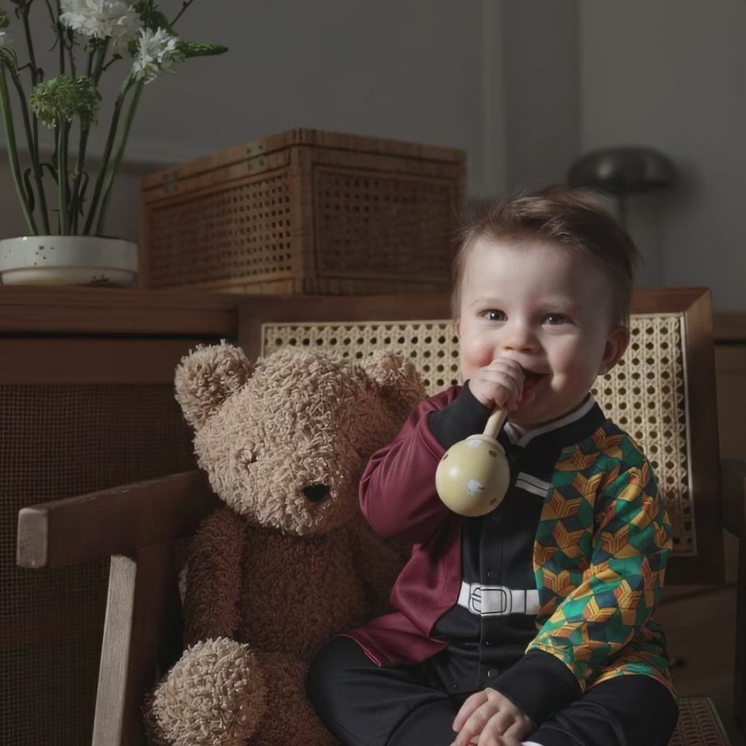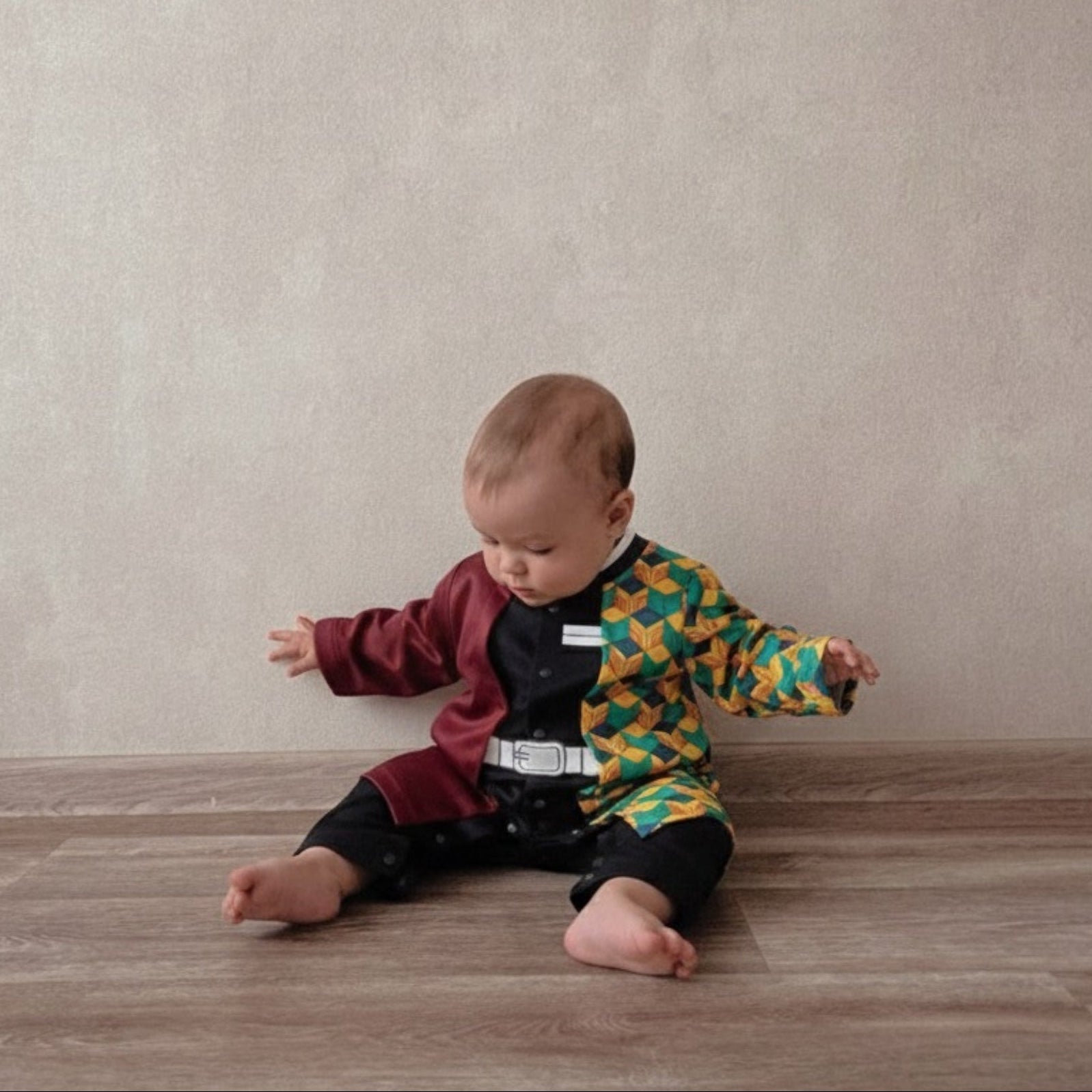 This romper features a striking half-and-half design inspired by Giyu Tomioka, blending elegance and boldness. Rich maroon meets a geometric green-and-orange pattern for a truly unique look. Soft, breathable fabric keeps your baby comfy from playtime to photoshoots.